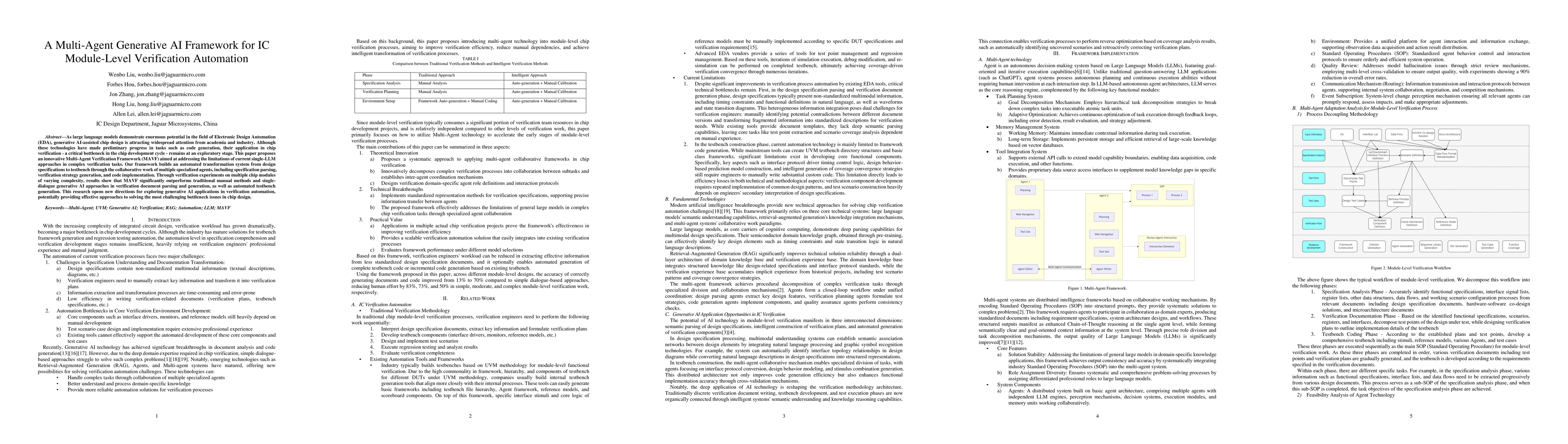 This paper introduces a Multi-Agent Verification Framework (MAVF) using generative AI for automating IC module-level verification, significantly outperforming traditional and single-model AI methods in parsing, strategy generation, and testbench creation for diverse chip complexities.