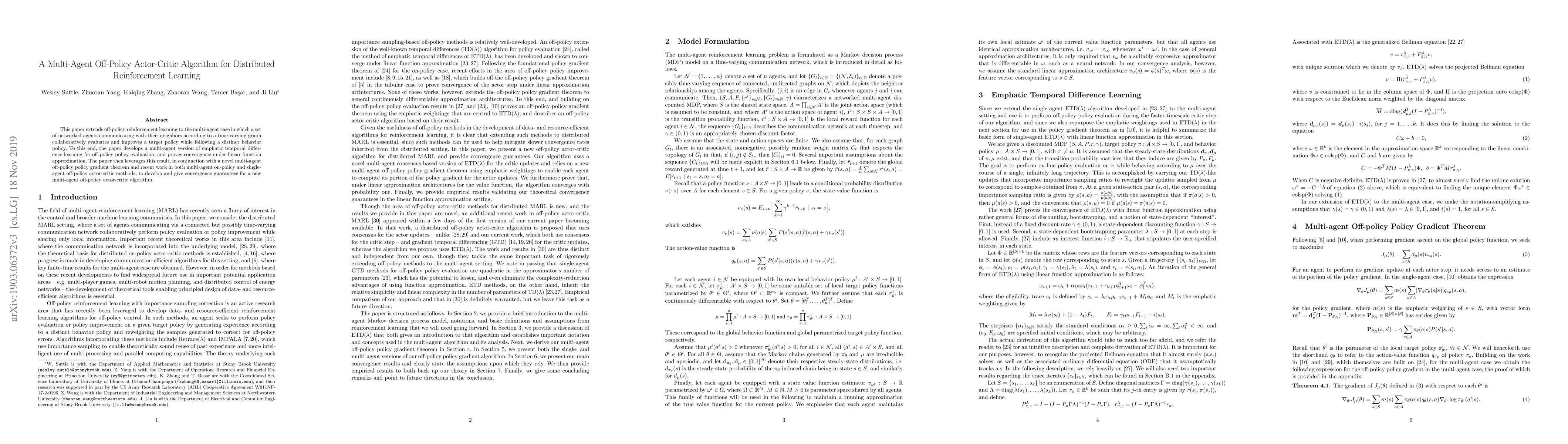 This paper introduces a multi-agent off-policy actor-critic algorithm for distributed reinforcement learning, extending off-policy methods to networked agents. It combines a novel off-policy policy evaluation method with a multi-agent off-policy policy gradient theorem to achieve convergence guarantees.