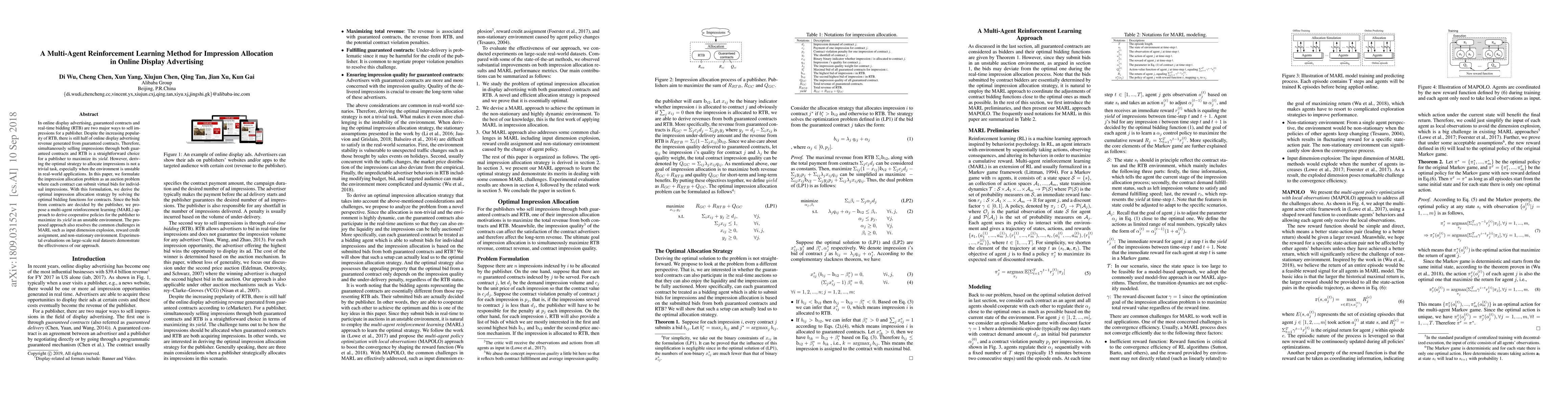 This paper proposes a multi-agent reinforcement learning method to optimize the allocation of impressions in online display advertising by balancing guaranteed contracts and real-time bidding. The method addresses challenges such as input dimension explosion, reward credit assignment, and non-stationary environments, and is validated through large-scale real dataset experiments.