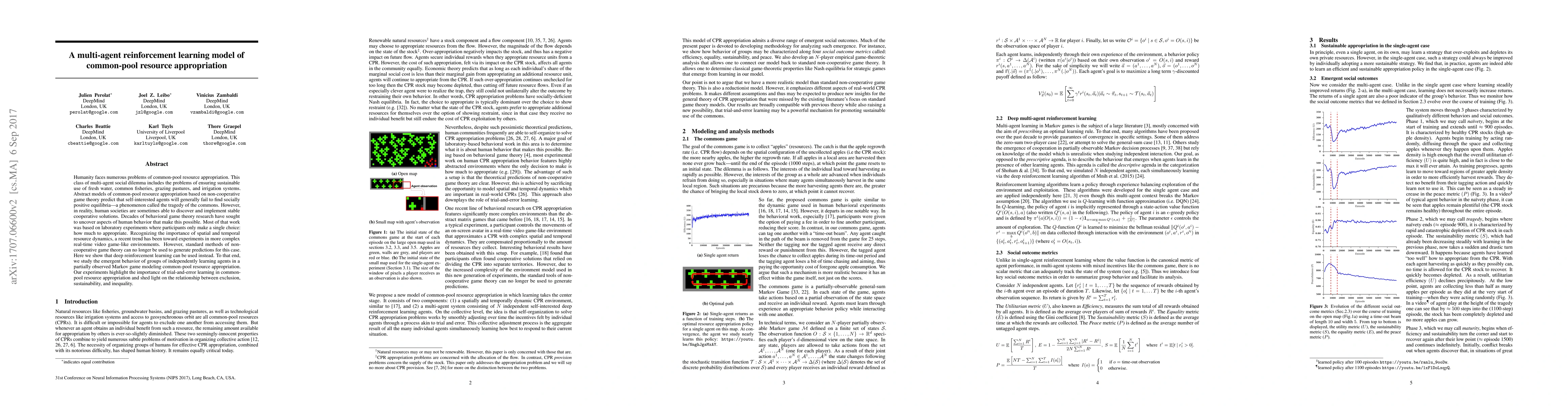 This paper explores a multi-agent reinforcement learning model to simulate common-pool resource appropriation, demonstrating how trial-and-error learning can lead to cooperative solutions and sustainable use, challenging the traditional prediction of the tragedy of the commons. The findings highlight the role of spatial and temporal dynamics in achieving equitable and sustainable resource management.