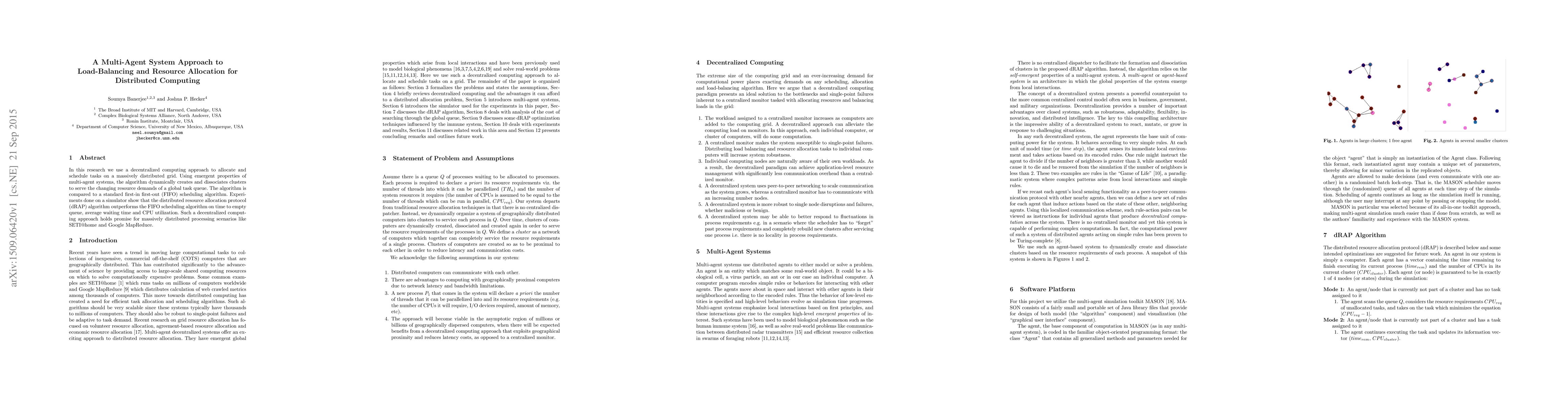 This research proposes a decentralized multi-agent system for load-balancing and resource allocation in distributed computing, dynamically forming clusters to meet fluctuating resource demands. The distributed resource allocation protocol (dRAP) outperforms traditional FIFO scheduling in terms of queue emptying time, average waiting time, and CPU utilization, suggesting its potential for large-scale distributed processing tasks.