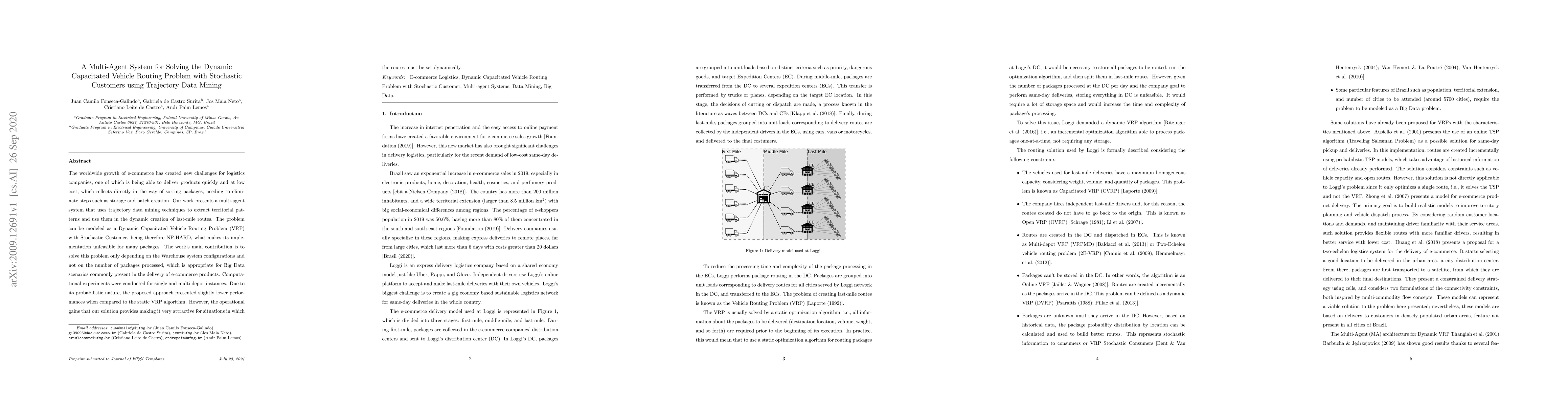 The worldwide growth of e-commerce has created new challenges for logistics companies, one of which is being able to deliver products quickly and at low cost, which reflects directly in the way of sorting packages, needing to eliminate steps such as storage and batch creation. Our work presents a multi-agent system that uses trajectory data mining techniques to extract territorial patterns and use them in the dynamic creation of last-mile routes. The problem can be modeled as a Dynamic Capacitated Vehicle Routing Problem (VRP) with Stochastic Customer, being therefore NP-HARD, what makes its implementation unfeasible for many packages. The work's main contribution is to solve this problem only depending on the Warehouse system configurations and not on the number of packages processed, which is appropriate for Big Data scenarios commonly present in the delivery of e-commerce products. Computational experiments were conducted for single and multi depot instances. Due to its probabilistic nature, the proposed approach presented slightly lower performances when compared to the static VRP algorithm. However, the operational gains that our solution provides making it very attractive for situations in which the routes must be set dynamically.