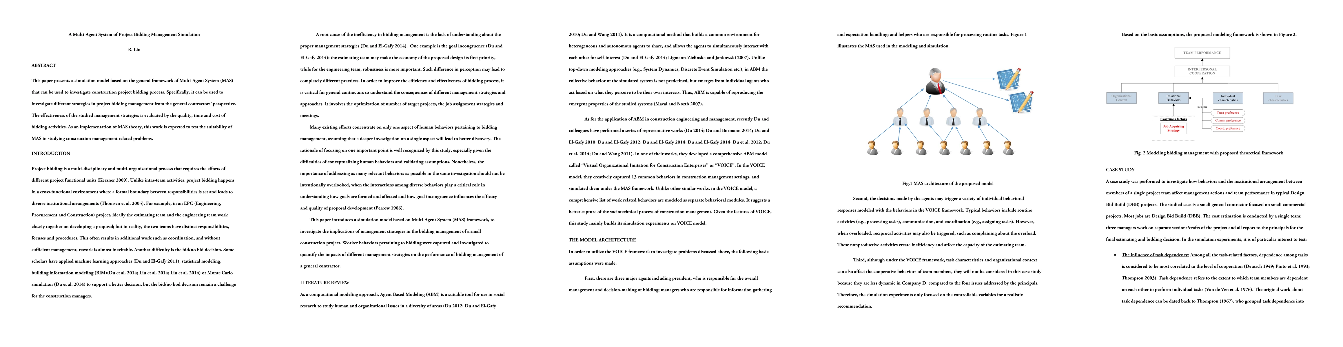 This paper introduces a Multi-Agent System (MAS) simulation model to study construction project bidding processes, evaluating management strategies based on quality, time, and cost. The study aims to assess MAS's applicability in construction management research.