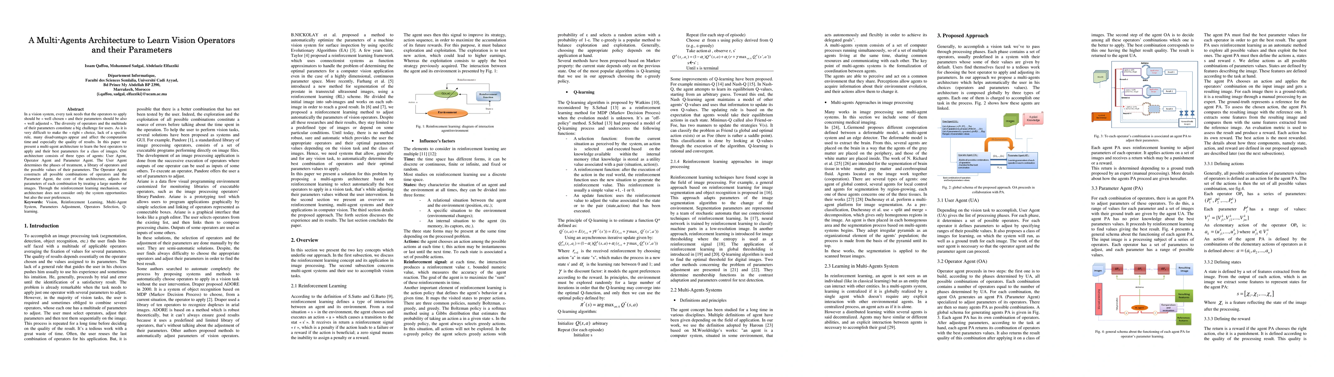 In a vision system, every task needs that the operators to apply should be {\guillemotleft} well chosen {\guillemotright} and their parameters should be also {\guillemotleft} well adjusted {\guillemotright}. The diversity of operators and the multitude of their parameters constitute a big challenge for users. As it is very difficult to make the {\guillemotleft} right {\guillemotright} choice, lack of a specific rule, many disadvantages appear and affect the computation time and especially the quality of results. In this paper we present a multi-agent architecture to learn the best operators to apply and their best parameters for a class of images. Our architecture consists of three types of agents: User Agent, Operator Agent and Parameter Agent. The User Agent determines the phases of treatment, a library of operators and the possible values of their parameters. The Operator Agent constructs all possible combinations of operators and the Parameter Agent, the core of the architecture, adjusts the parameters of each combination by treating a large number of images. Through the reinforcement learning mechanism, our architecture does not consider only the system opportunities but also the user preferences.