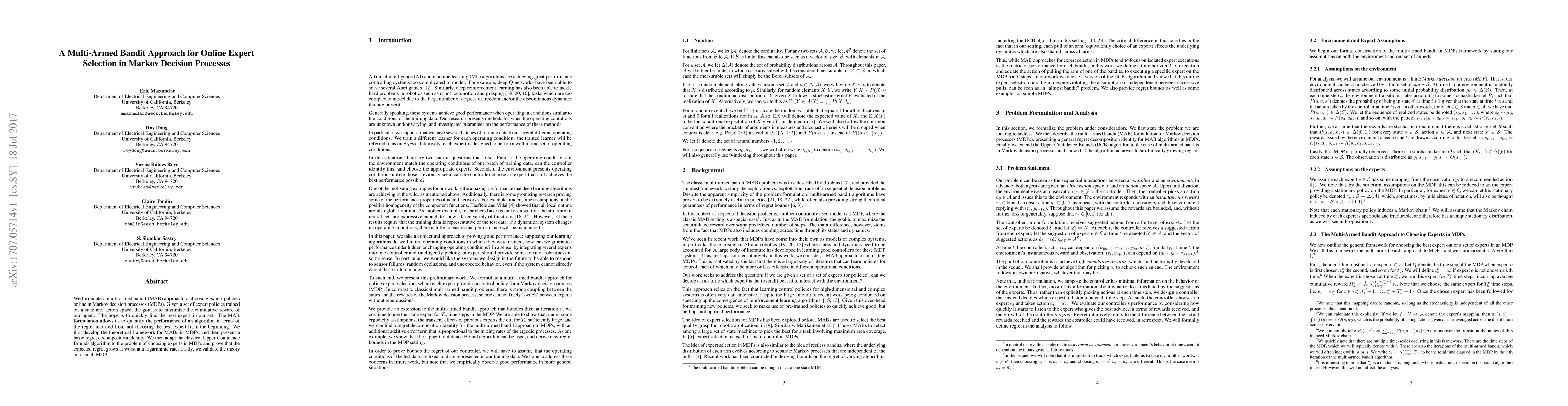 This paper proposes a multi-armed bandit approach to dynamically select expert policies in Markov decision processes to maximize cumulative rewards. The study adapts the Upper Confidence Bounds algorithm to this context and proves that regret grows logarithmically, validated through a small MDP example.
