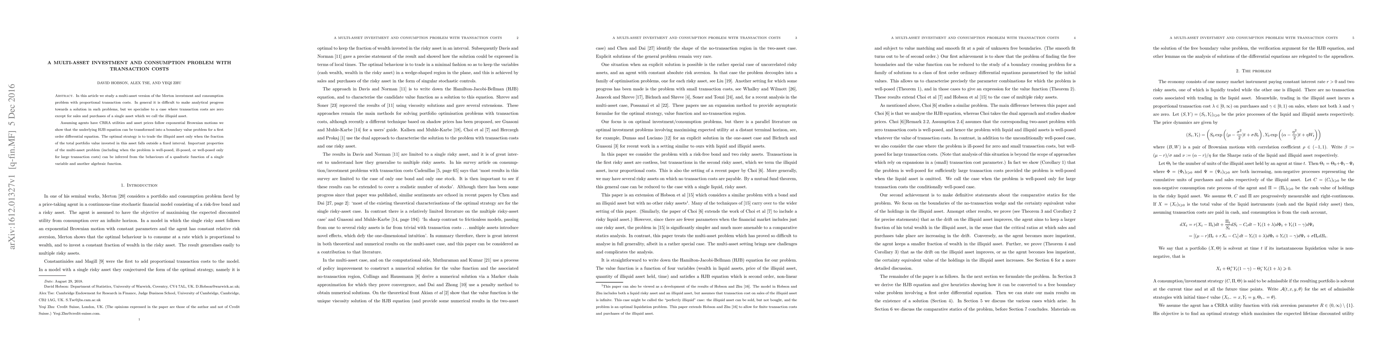 This paper investigates a multi-asset investment and consumption problem under proportional transaction costs, focusing on a scenario where costs apply only to a single illiquid asset. The authors derive a boundary value problem for a first-order differential equation from the Hamilton-Jacobi-Bellman (HJB) equation, revealing optimal trading strategies based on portfolio allocation thresholds.