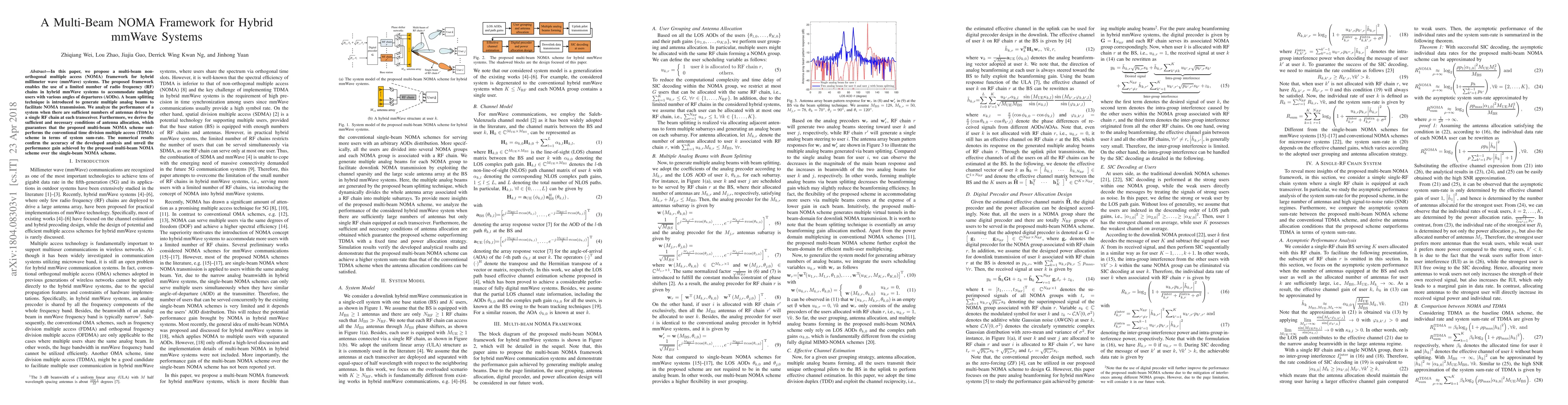 This paper proposes a multi-beam NOMA framework for hybrid mmWave systems, utilizing a beam splitting technique to generate multiple analog beams for NOMA transmission. The analysis shows that the proposed scheme outperforms conventional TDMA in terms of system sum-rate, with numerical results validating the performance gains.
