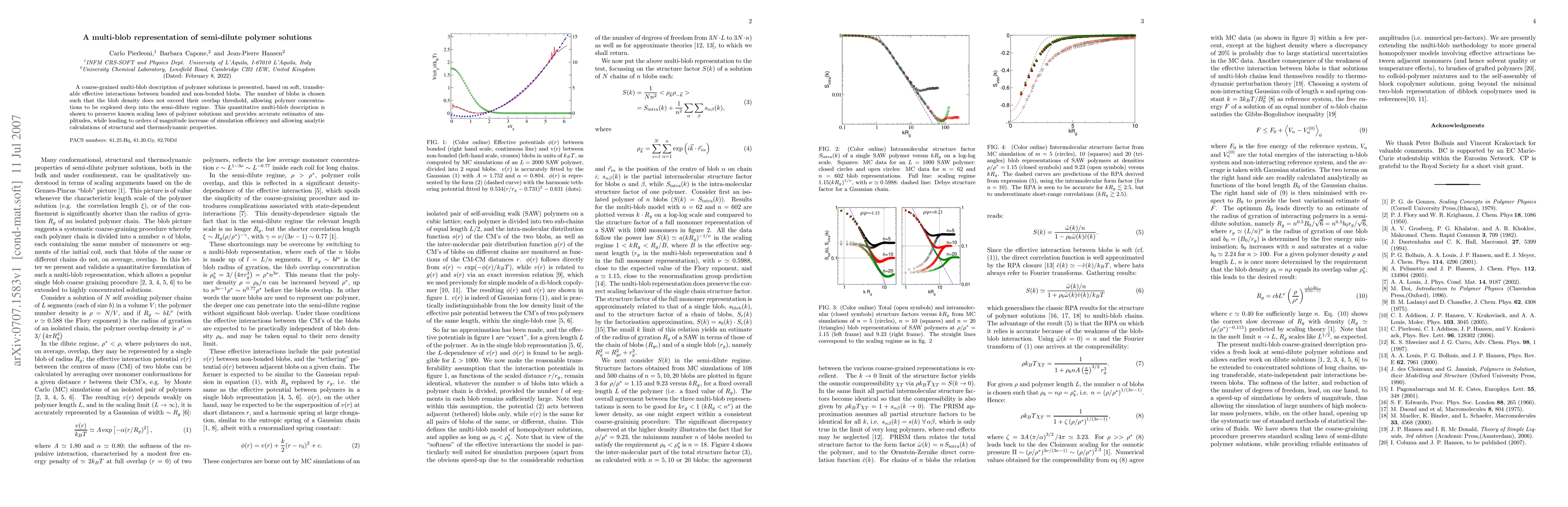 This paper introduces a coarse-grained multi-blob model for semi-dilute polymer solutions, preserving known scaling laws and significantly enhancing simulation efficiency while providing accurate estimates of structural and thermodynamic properties. The model uses soft, transferable interactions between blobs to explore high polymer concentrations.