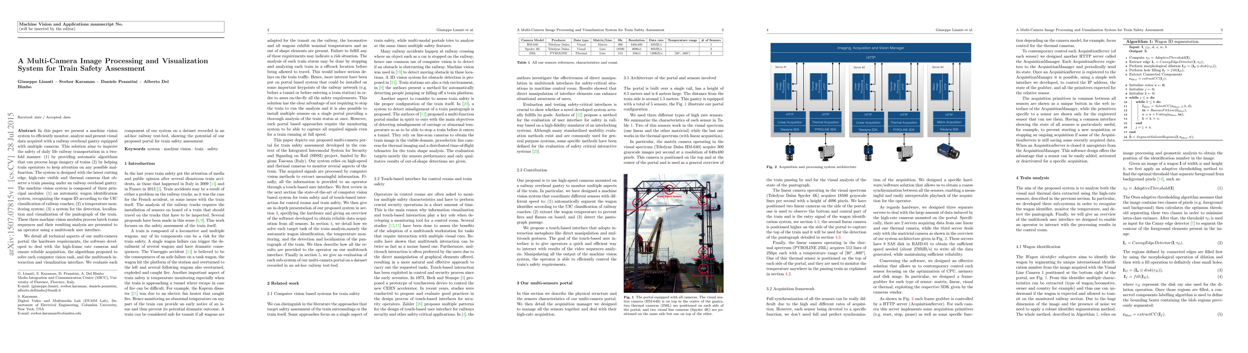 In this paper we present a machine vision system to efficiently monitor, analyze and present visual data acquired with a railway overhead gantry equipped with multiple cameras. This solution aims to improve the safety of daily life railway transportation in a two- fold manner: (1) by providing automatic algorithms that can process large imagery of trains (2) by helping train operators to keep attention on any possible malfunction. The system is designed with the latest cutting edge, high-rate visible and thermal cameras that ob- serve a train passing under an railway overhead gantry. The machine vision system is composed of three principal modules: (1) an automatic wagon identification system, recognizing the wagon ID according to the UIC classification of railway coaches; (2) a temperature monitoring system; (3) a system for the detection, localization and visualization of the pantograph of the train. These three machine vision modules process batch trains sequences and their resulting analysis are presented to an operator using a multitouch user interface. We detail all technical aspects of our multi-camera portal: the hardware requirements, the software developed to deal with the high-frame rate cameras and ensure reliable acquisition, the algorithms proposed to solve each computer vision task, and the multitouch interaction and visualization interface. We evaluate each component of our system on a dataset recorded in an ad-hoc railway test-bed, showing the potential of our proposed portal for train safety assessment.