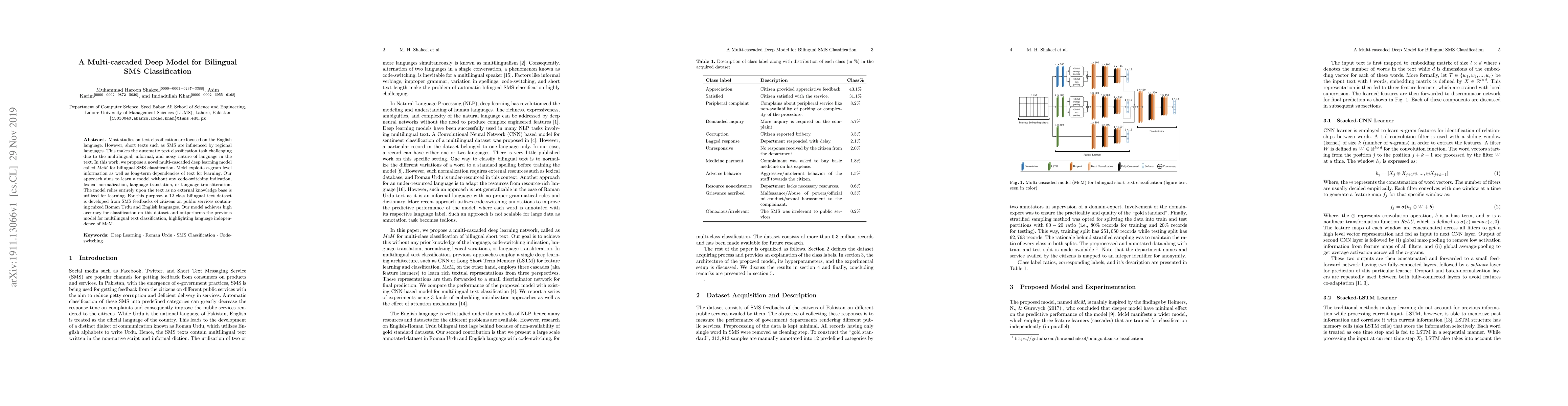 Most studies on text classification are focused on the English language. However, short texts such as SMS are influenced by regional languages. This makes the automatic text classification task challenging due to the multilingual, informal, and noisy nature of language in the text. In this work, we propose a novel multi-cascaded deep learning model called McM for bilingual SMS classification. McM exploits $n$-gram level information as well as long-term dependencies of text for learning. Our approach aims to learn a model without any code-switching indication, lexical normalization, language translation, or language transliteration. The model relies entirely upon the text as no external knowledge base is utilized for learning. For this purpose, a 12 class bilingual text dataset is developed from SMS feedbacks of citizens on public services containing mixed Roman Urdu and English languages. Our model achieves high accuracy for classification on this dataset and outperforms the previous model for multilingual text classification, highlighting language independence of McM.