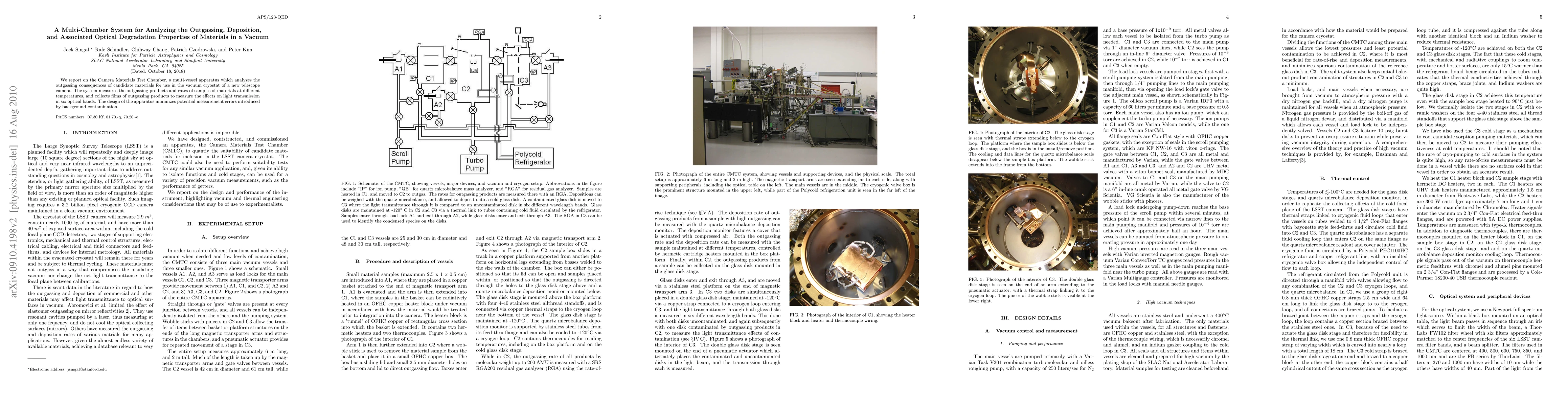 This paper describes a multi-chamber system for evaluating the outgassing and optical degradation of materials in a vacuum environment, specifically for telescope camera applications. The system measures outgassing rates and assesses the impact on light transmission across six optical bands.