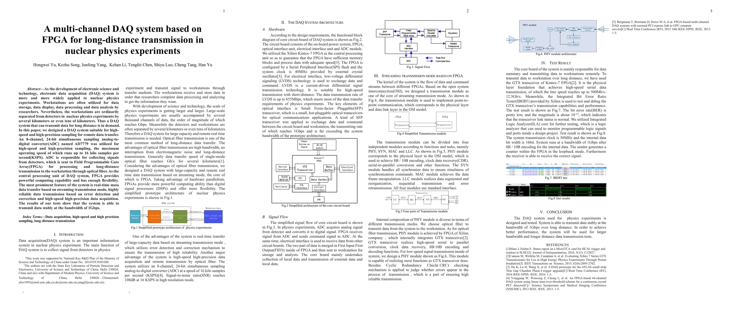 This paper presents a multi-channel DAQ system based on FPGA for long-distance transmission in nuclear physics experiments, utilizing an 8-channel ADC for high-speed sampling and FPGA for real-time data processing and optical fiber transmission, achieving stable data transfer at 1Gbps bandwidth.