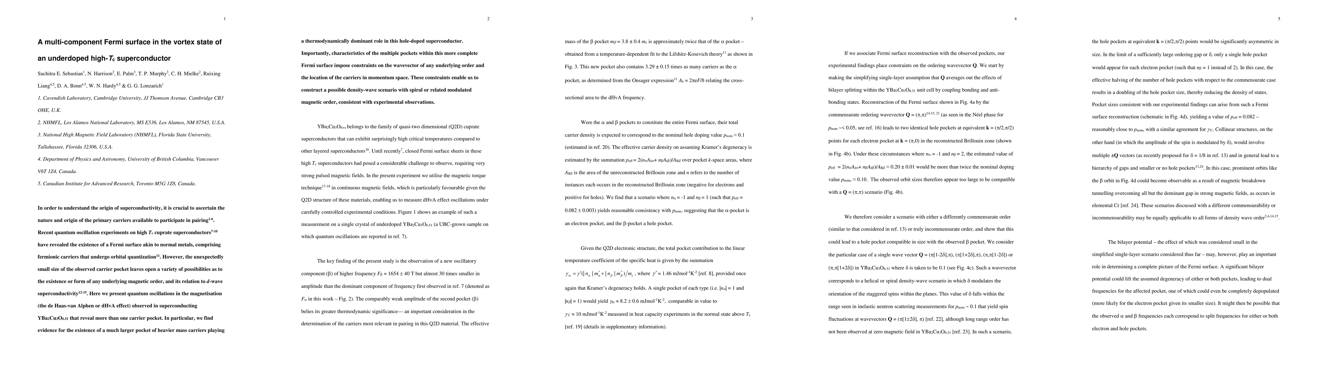 In order to understand the origin of superconductivity, it is crucial to ascertain the nature and origin of the primary carriers available to participate in pairing. Recent quantum oscillation experiments on high Tc cuprate superconductors have revealed the existence of a Fermi surface akin to normal metals, comprising fermionic carriers that undergo orbital quantization. However, the unexpectedly small size of the observed carrier pocket leaves open a variety of possibilities as to the existence or form of any underlying magnetic order, and its relation to d-wave superconductivity. Here we present quantum oscillations in the magnetisation (the de Haas-van Alphen or dHvA effect) observed in superconducting YBa2Cu3O6.51 that reveal more than one carrier pocket. In particular, we find evidence for the existence of a much larger pocket of heavier mass carriers playing a thermodynamically dominant role in this hole-doped superconductor. Importantly, characteristics of the multiple pockets within this more complete Fermi surface impose constraints on the wavevector of any underlying order and the location of the carriers in momentum space. These constraints enable us to construct a possible density-wave scenario with spiral or related modulated magnetic order, consistent with experimental observations.