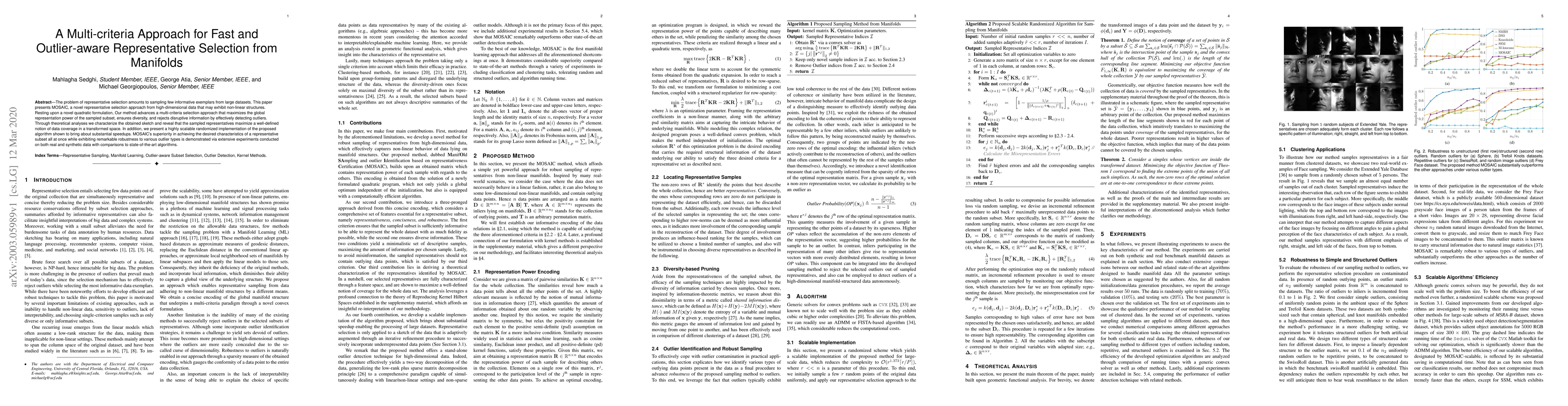 The problem of representative selection amounts to sampling few informative exemplars from large datasets. This paper presents MOSAIC, a novel representative selection approach from high-dimensional data that may exhibit non-linear structures. Resting upon a novel quadratic formulation, Our method advances a multi-criteria selection approach that maximizes the global representation power of the sampled subset, ensures diversity, and rejects disruptive information by effectively detecting outliers. Through theoretical analyses we characterize the obtained sketch and reveal that the sampled representatives maximize a well-defined notion of data coverage in a transformed space. In addition, we present a highly scalable randomized implementation of the proposed algorithm shown to bring about substantial speedups. MOSAIC's superiority in achieving the desired characteristics of a representative subset all at once while exhibiting remarkable robustness to various outlier types is demonstrated via extensive experiments conducted on both real and synthetic data with comparisons to state-of-the-art algorithms.