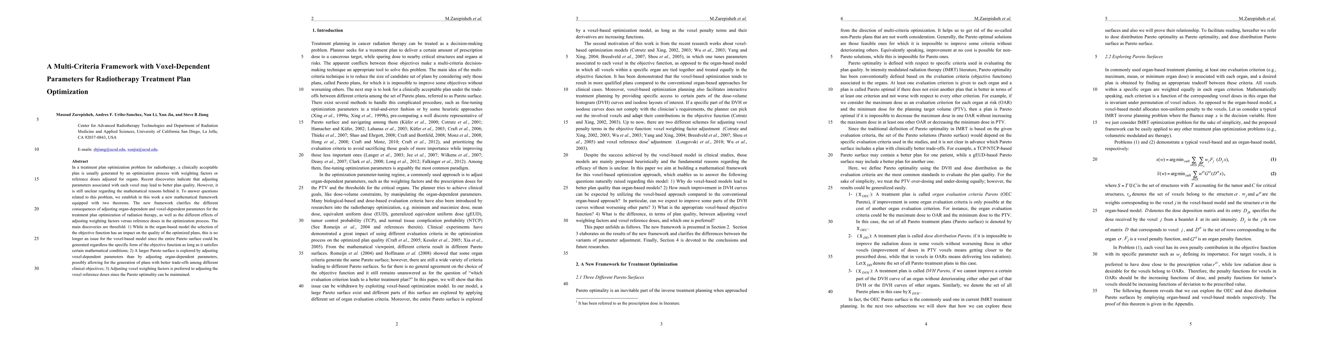 This paper introduces a new mathematical framework for optimizing radiotherapy treatment plans using voxel-dependent parameters, demonstrating that it generates a larger Pareto surface and better trade-offs compared to organ-based models. It concludes that voxel-based adjustments maintain Pareto optimality better than reference dose adjustments.