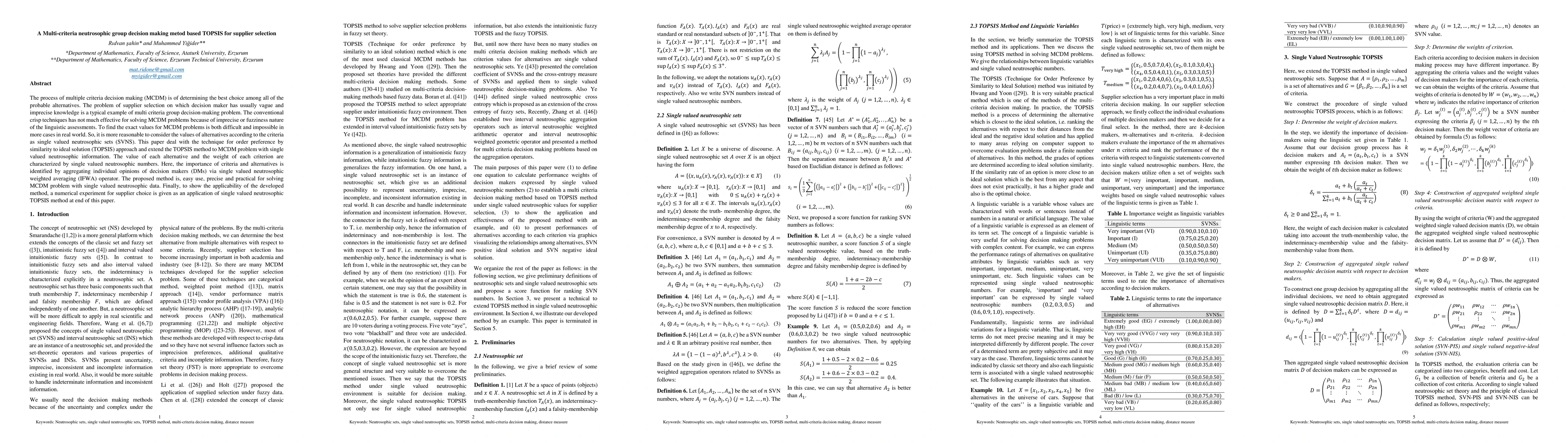 This paper proposes a multi-criteria group decision-making method based on the TOPSIS approach for supplier selection using single valued neutrosophic sets to handle imprecise and fuzzy linguistic assessments. The method aggregates decision makers' opinions via a neutrosophic weighted averaging operator and demonstrates practical applicability through a supplier selection example.