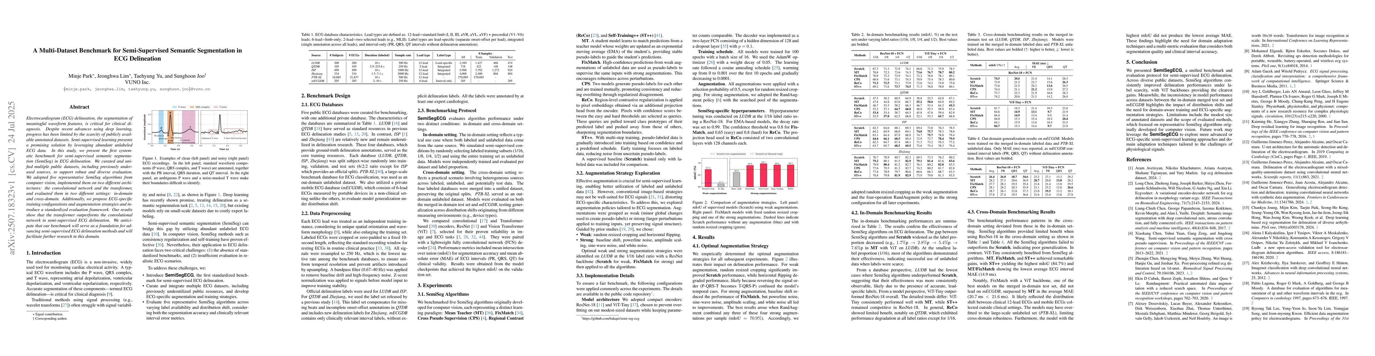 This study introduces the first benchmark for semi-supervised semantic segmentation in ECG delineation, combining multiple datasets and evaluating five algorithms on convolutional and transformer networks. The transformer outperforms the convolutional network, setting a foundation for future research in this area.