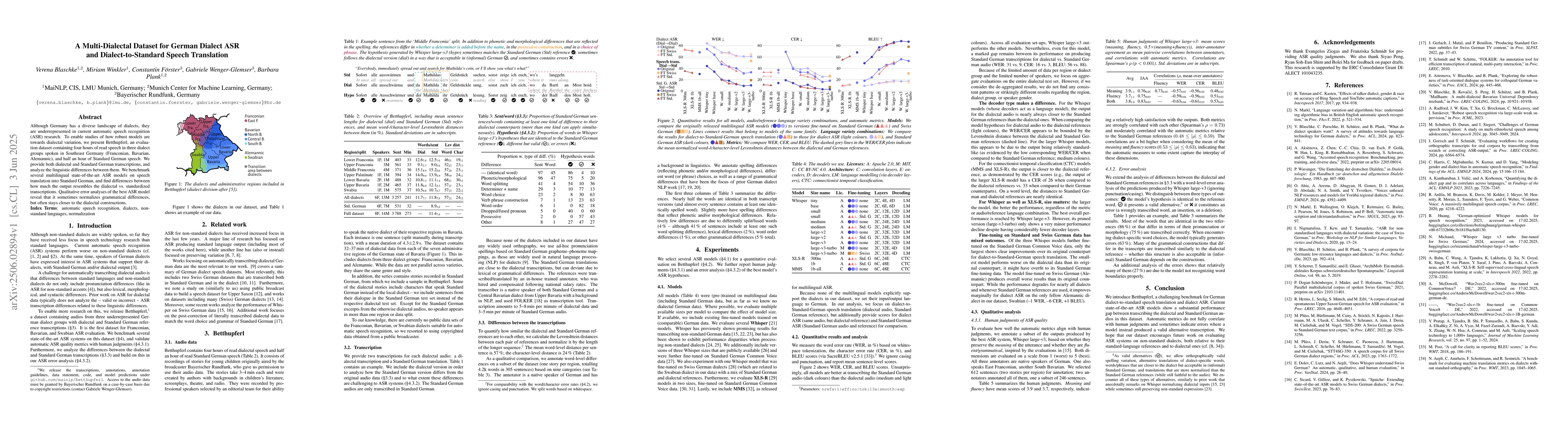 The research presents Betthupferl, a multi-dialectal dataset for German dialect ASR and dialect-to-Standard speech translation, containing four hours of read speech in three dialect groups (Franconian, Bavarian, Alemannic) and half an hour of Standard German speech, with both dialectal and Standard German transcriptions provided.