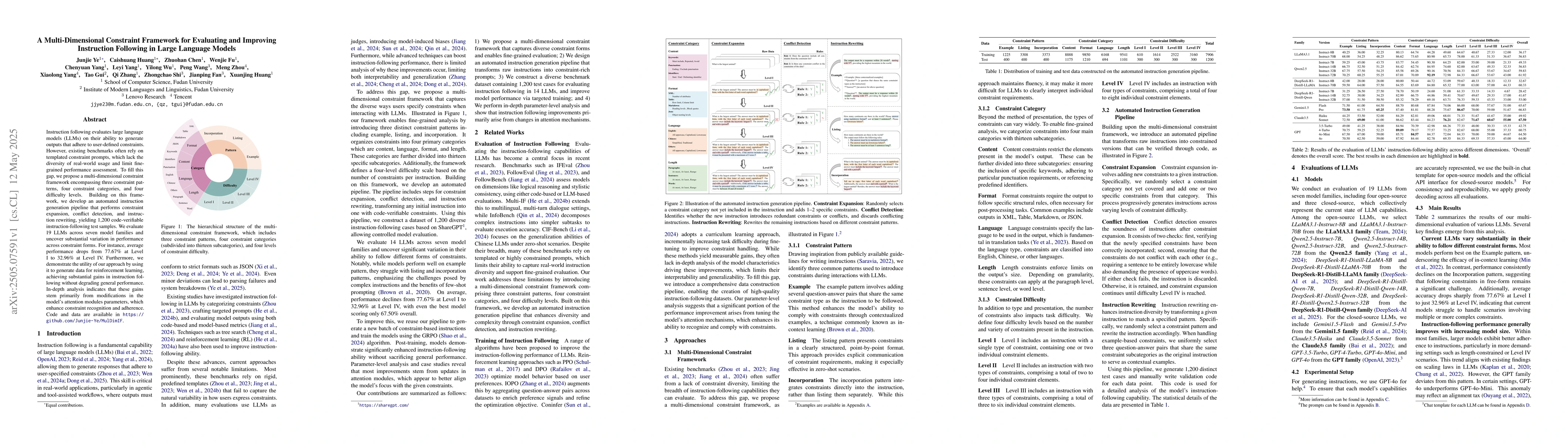 The research proposes a multi-dimensional constraint framework with three patterns, four categories, and four difficulty levels for evaluating instruction following in LLMs. An automated instruction generation pipeline is developed for constraint expansion, conflict detection, and rewriting, resulting in 1,200 code-verifiable test samples.