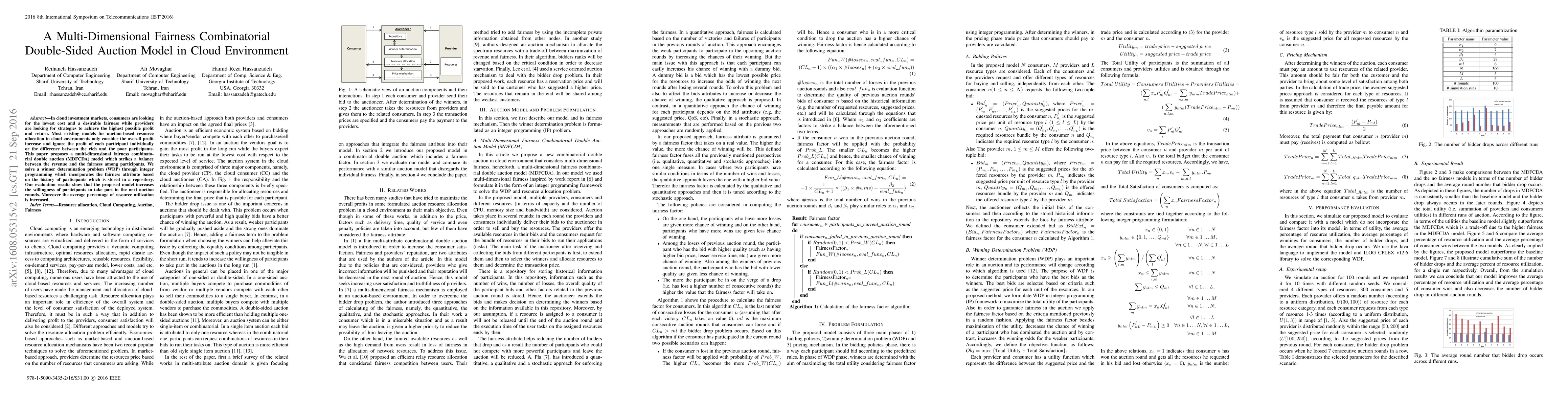 This paper introduces a multi-dimensional fairness combinatorial double-sided auction model for cloud environments, balancing revenue and fairness among participants. The proposed MDFCDA model uses integer programming to solve the winner determination problem, enhancing participant satisfaction and resource utilization.