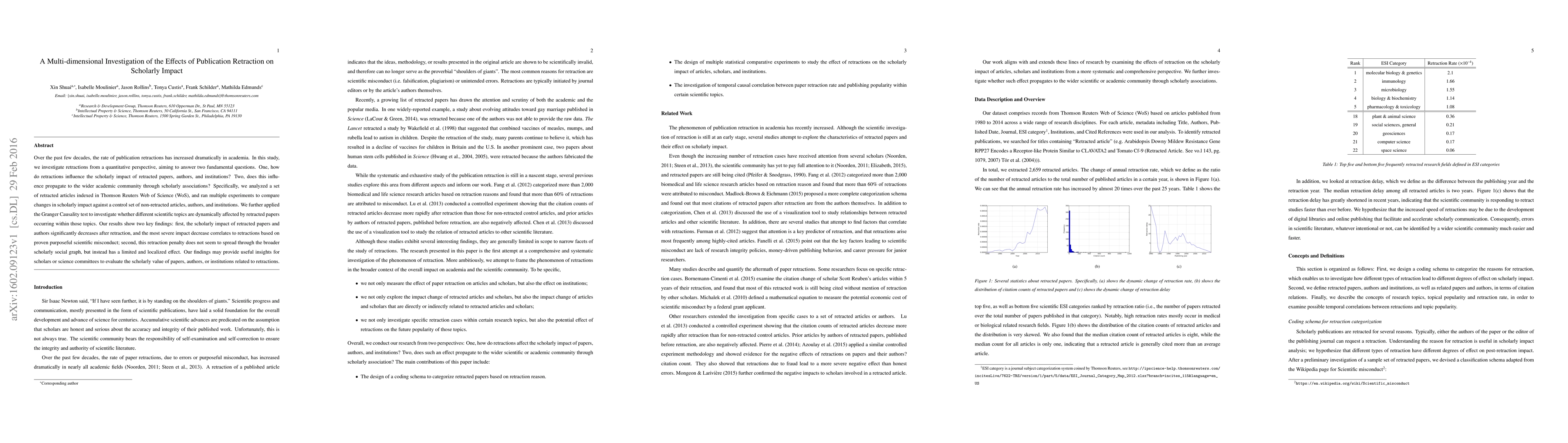 Over the past few decades, the rate of publication retractions has increased dramatically in academia. In this study, we investigate retractions from a quantitative perspective, aiming to answer two fundamental questions. One, how do retractions influence the scholarly impact of retracted papers, authors, and institutions? Two, does this influence propagate to the wider academic community through scholarly associations? Specifically, we analyzed a set of retracted articles indexed in Thomson Reuters Web of Science (WoS), and ran multiple experiments to compare changes in scholarly impact against a control set of non-retracted articles, authors, and institutions. We further applied the Granger Causality test to investigate whether different scientific topics are dynamically affected by retracted papers occurring within those topics. Our results show two key findings: first, the scholarly impact of retracted papers and authors significantly decreases after retraction, and the most severe impact decrease correlates to retractions based on proven purposeful scientific misconduct; second, this retraction penalty does not seem to spread through the broader scholarly social graph, but instead has a limited and localized effect. Our findings may provide useful insights for scholars or science committees to evaluate the scholarly value of papers, authors, or institutions related to retractions.