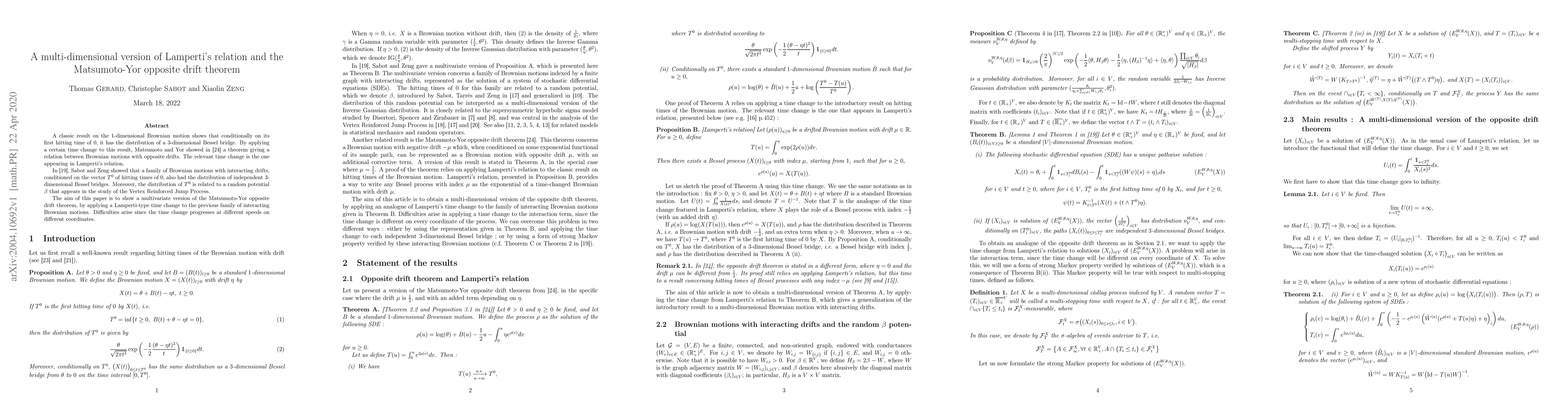 A classic result on the 1-dimensional Brownian motion shows that conditionally on its first hitting time of 0, it has the distribution of a 3-dimensional Bessel bridge. By applying a certain time-change to this result, Matsumoto and Yor showed a theorem giving a relation between Brownian motions with opposite drifts. The relevant time change is the one appearing in Lamperti's relation. Sabot and Zeng showed that a family of Brownian motions with interacting drifts, conditioned on the vector of hitting times of 0, also has the distribution of independent 3-dimensional Bessel bridges. Moreover, the distribution of these hitting times is related to a random potential that appears in the study of the vertex-reinforced jump process. The aim of this paper is to prove a multivariate version of the Matsumoto-Yor opposite drift theorem, by applying a Lamperti-type time change to the previous family of interacting Brownian motions. Difficulties arise since the time change progresses at different speeds on different coordinates.