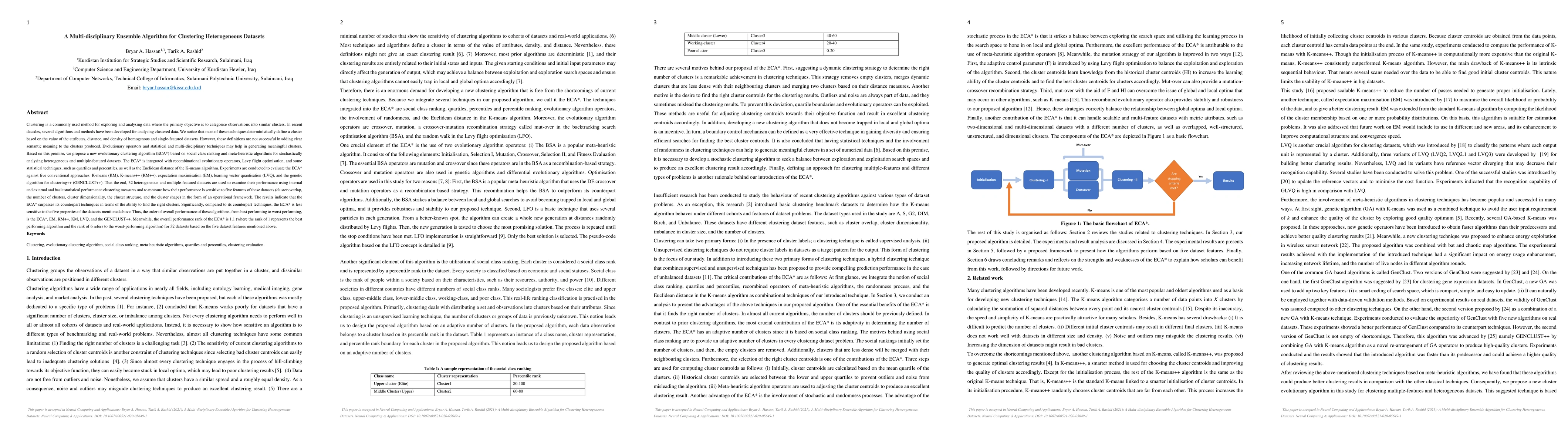 A new evolutionary clustering algorithm, ECAStar, is proposed to generate meaningful clusters in heterogeneous datasets using social class ranking and meta-heuristic algorithms. The algorithm outperforms conventional approaches like K-means and genetic algorithm in experiments.