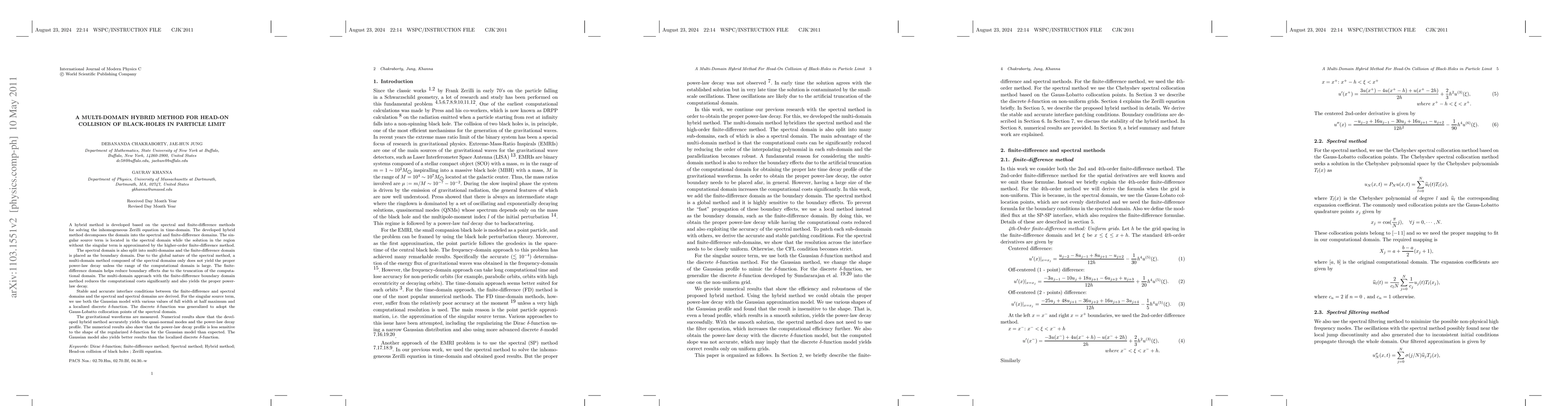 A hybrid method is developed based on the spectral and finite-difference methods for solving the inhomogeneous Zerilli equation in time-domain. The developed hybrid method decomposes the domain into the spectral and finite-difference domains. The singular source term is located in the spectral domain while the solution in the region without the singular term is approximated by the higher-order finite-difference method. The spectral domain is also split into multi-domains and the finite-difference domain is placed as the boundary domain. Due to the global nature of the spectral method, a multi-domain method composed of the spectral domains only does not yield the proper power-law decay unless the range of the computational domain is large. The finite-difference domain helps reduce boundary effects due to the truncation of the computational domain. The multi-domain approach with the finite-difference boundary domain method reduces the computational costs significantly and also yields the proper power-law decay. Stable and accurate interface conditions between the finite-difference and spectral domains and the spectral and spectral domains are derived. For the singular source term, we use both the Gaussian model with various values of full width at half maximum and a localized discrete $\delta$-function. The discrete $\delta$-function was generalized to adopt the Gauss-Lobatto collocation points of the spectral domain. The gravitational waveforms are measured. Numerical results show that the developed hybrid method accurately yields the quasi-normal modes and the power-law decay profile. The numerical results also show that the power-law decay profile is less sensitive to the shape of the regularized $\delta$-function for the Gaussian model than expected. The Gaussian model also yields better results than the localized discrete $\delta$-function.