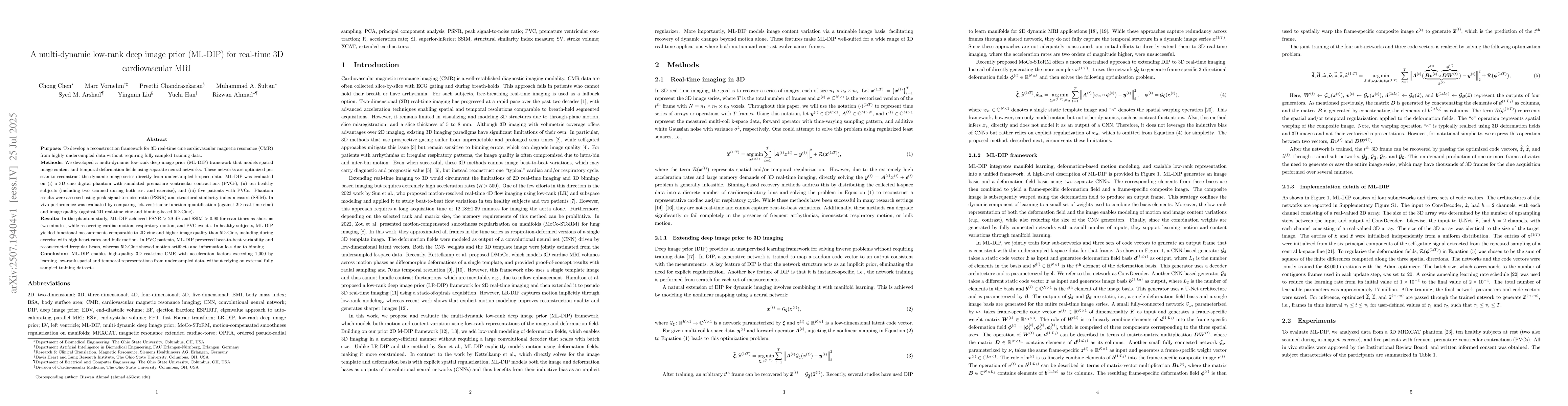 Purpose: To develop a reconstruction framework for 3D real-time cine cardiovascular magnetic resonance (CMR) from highly undersampled data without requiring fully sampled training data. Methods: We developed a multi-dynamic low-rank deep image prior (ML-DIP) framework that models spatial image content and temporal deformation fields using separate neural networks. These networks are optimized per scan to reconstruct the dynamic image series directly from undersampled k-space data. ML-DIP was evaluated on (i) a 3D cine digital phantom with simulated premature ventricular contractions (PVCs), (ii) ten healthy subjects (including two scanned during both rest and exercise), and (iii) five patients with PVCs. Phantom results were assessed using peak signal-to-noise ratio (PSNR) and structural similarity index measure (SSIM). In vivo performance was evaluated by comparing left-ventricular function quantification (against 2D real-time cine) and image quality (against 2D real-time cine and binning-based 5D-Cine). Results: In the phantom study, ML-DIP achieved PSNR > 29 dB and SSIM > 0.90 for scan times as short as two minutes, while recovering cardiac motion, respiratory motion, and PVC events. In healthy subjects, ML-DIP yielded functional measurements comparable to 2D cine and higher image quality than 5D-Cine, including during exercise with high heart rates and bulk motion. In PVC patients, ML-DIP preserved beat-to-beat variability and reconstructed irregular beats, whereas 5D-Cine showed motion artifacts and information loss due to binning. Conclusion: ML-DIP enables high-quality 3D real-time CMR with acceleration factors exceeding 1,000 by learning low-rank spatial and temporal representations from undersampled data, without relying on external fully sampled training datasets.