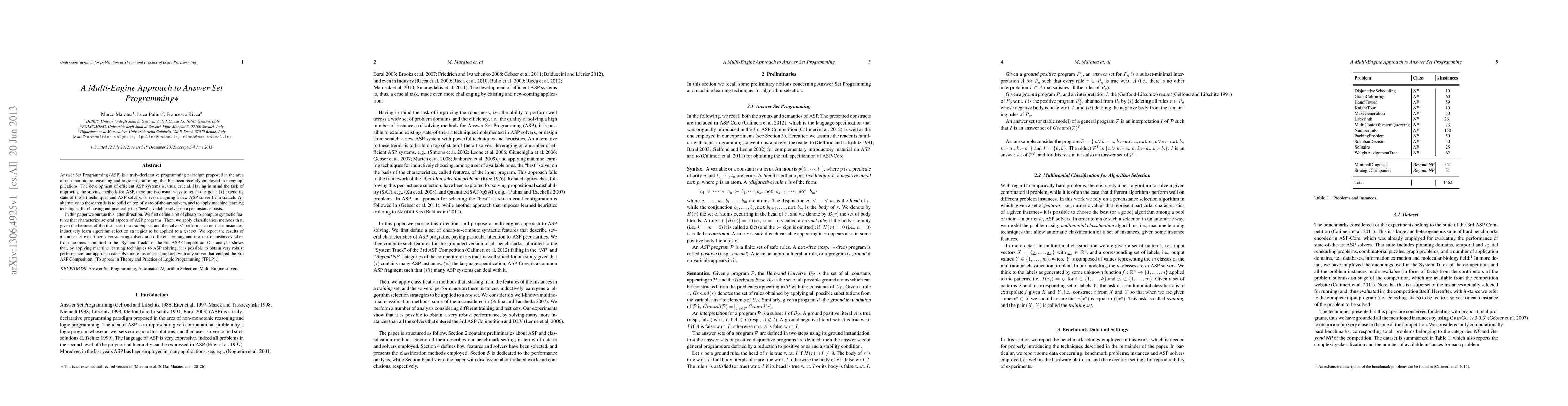 This paper proposes an alternative to traditional ASP solver development by employing machine learning to automatically select the best solver for specific instances based on syntactic features. Experiments show that this multi-engine approach outperforms individual solvers from the 3rd ASP Competition.