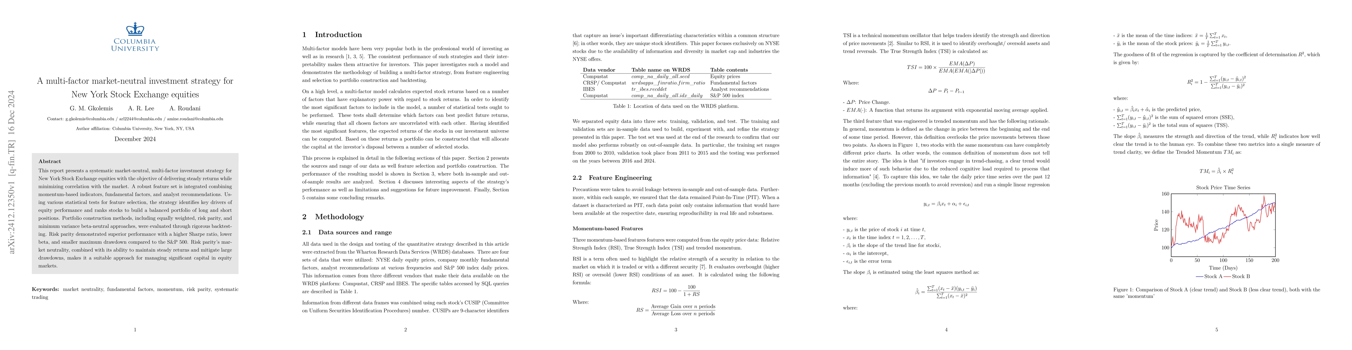 This report develops a multi-factor market-neutral investment strategy for NYSE equities, integrating momentum, fundamentals, and analyst data to create a balanced portfolio. Risk parity methodology shows superior performance with higher returns, lower risk, and reduced drawdowns compared to the S&P 500.