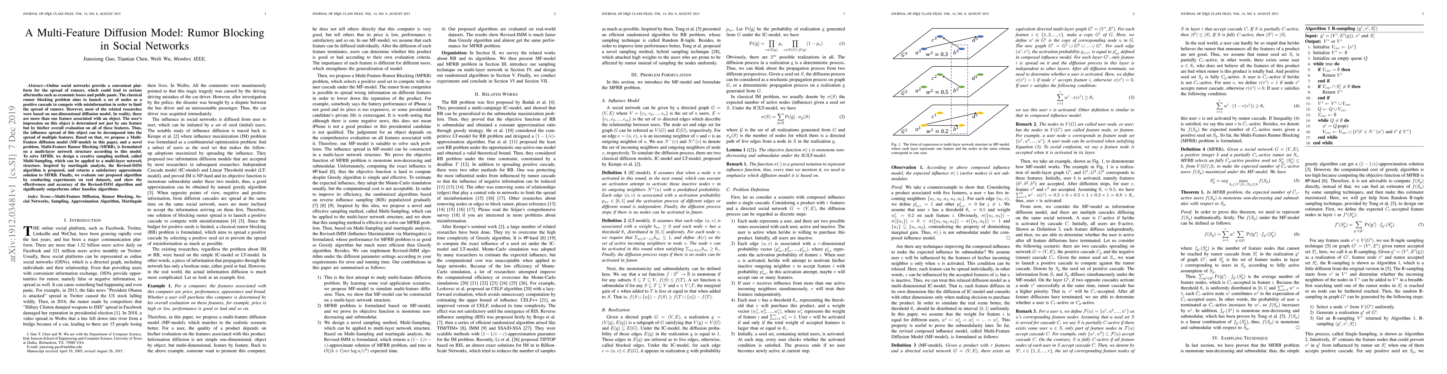 This paper proposes a Multi-Feature Diffusion Model (MF-model) to address the rumor blocking problem in social networks, considering multiple features influencing user perception. It introduces a novel Multi-Feature Rumor Blocking (MFRB) problem and presents a Revised-IMM algorithm with a Multi-Sampling method for effective solution, which outperforms baseline algorithms in experiments on real datasets.