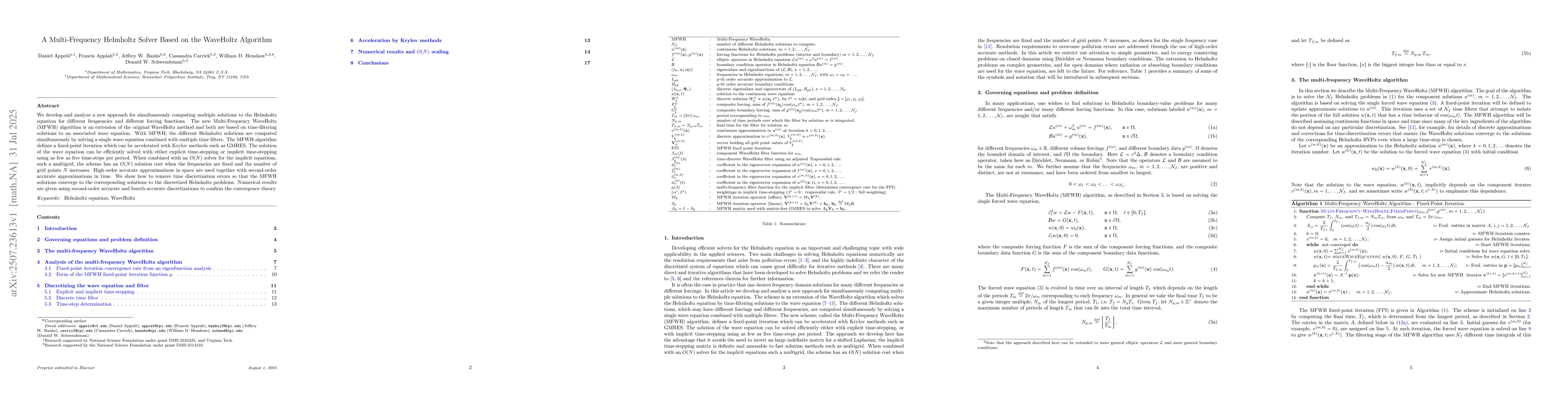 We develop and analyze a new approach for simultaneously computing multiple solutions to the Helmholtz equation for different frequencies and different forcing functions. The new Multi-Frequency WaveHoltz (MFWH) algorithm is an extension of the original WaveHoltz method and both are based on time-filtering solutions to an associated wave equation. With MFWH, the different Helmholtz solutions are computed simultaneously by solving a single wave equation combined with multiple time filters. The MFWH algorithm defines a fixed-point iteration which can be accelerated with Krylov methods such as GMRES. The solution of the wave equation can be efficiently solved with either explicit time-stepping or implicit time-stepping using as few as five time-steps per period. When combined with an $O(N)$ solver for the implicit equations, such a multigrid, the scheme has an $O(N)$ solution cost when the frequencies are fixed and the number of grid points $N$ increases. High-order accurate approximations in space are used together with second-order accurate approximations in time. We show how to remove time discretization errors so that the MFWH solutions converge to the corresponding solutions to the discretized Helmholtz problems. Numerical results are given using second-order accurate and fourth-accurate discretizations to confirm the convergence theory.