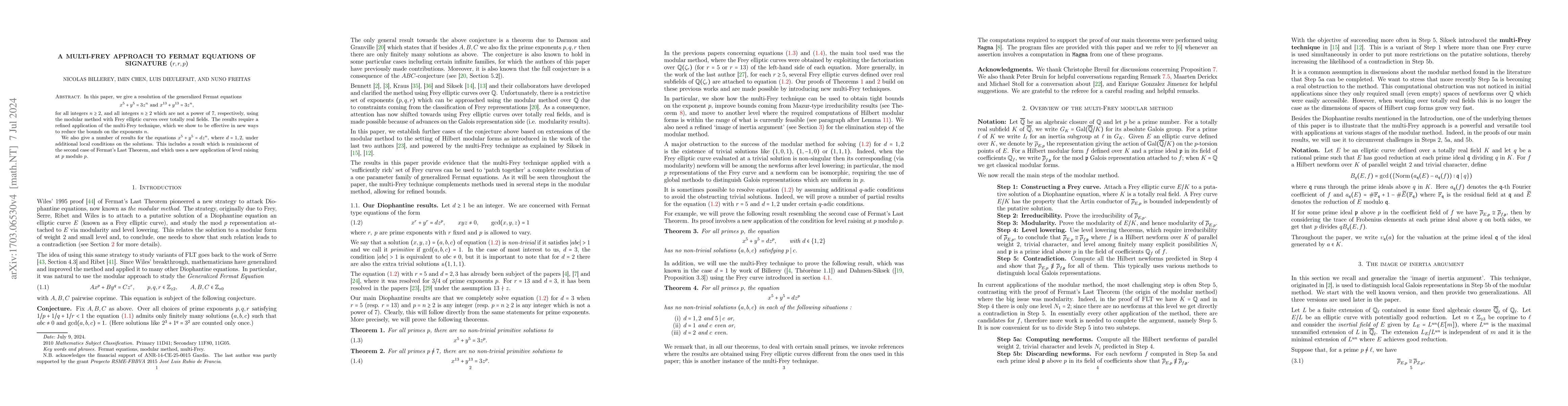 This paper resolves generalized Fermat equations of the forms \(x^5 + y^5 = 3z^n\) and \(x^{13} + y^{13} = 3z^n\) using the modular method and Frey elliptic curves. It refines the multi-Frey technique to reduce bounds on the exponents \(n\), especially when \(n\) is not a multiple of \(7\).