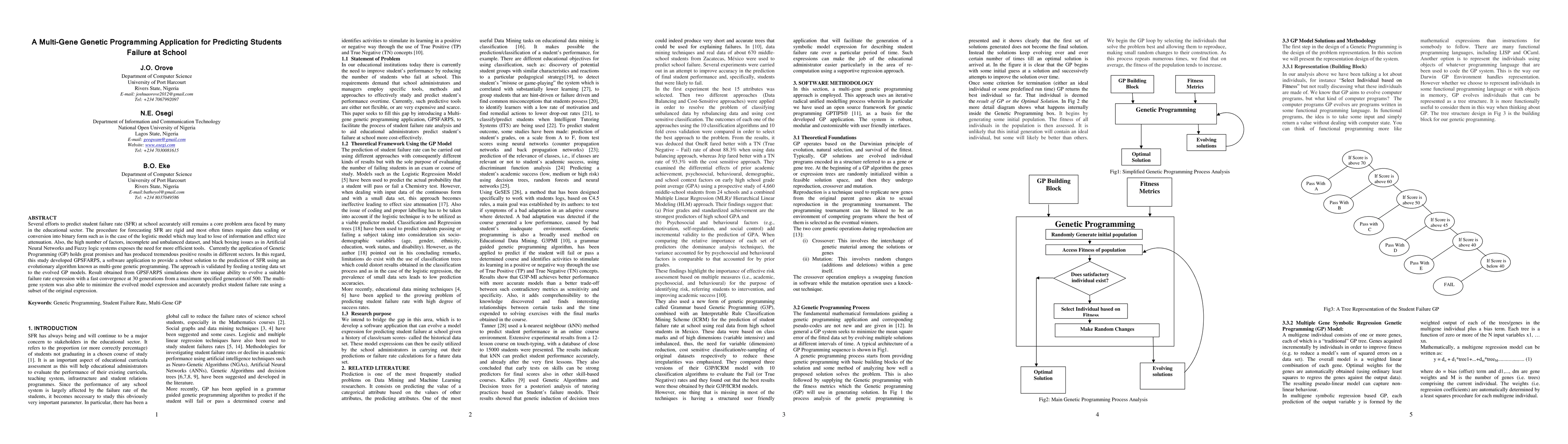 Several efforts to predict student failure rate (SFR) at school accurately still remains a core problem area faced by many in the educational sector. The procedure for forecasting SFR are rigid and most often times require data scaling or conversion into binary form such as is the case of the logistic model which may lead to lose of information and effect size attenuation. Also, the high number of factors, incomplete and unbalanced dataset, and black boxing issues as in Artificial Neural Networks and Fuzzy logic systems exposes the need for more efficient tools. Currently the application of Genetic Programming (GP) holds great promises and has produced tremendous positive results in different sectors. In this regard, this study developed GPSFARPS, a software application to provide a robust solution to the prediction of SFR using an evolutionary algorithm known as multi-gene genetic programming. The approach is validated by feeding a testing data set to the evolved GP models. Result obtained from GPSFARPS simulations show its unique ability to evolve a suitable failure rate expression with a fast convergence at 30 generations from a maximum specified generation of 500. The multi-gene system was also able to minimize the evolved model expression and accurately predict student failure rate using a subset of the original expression