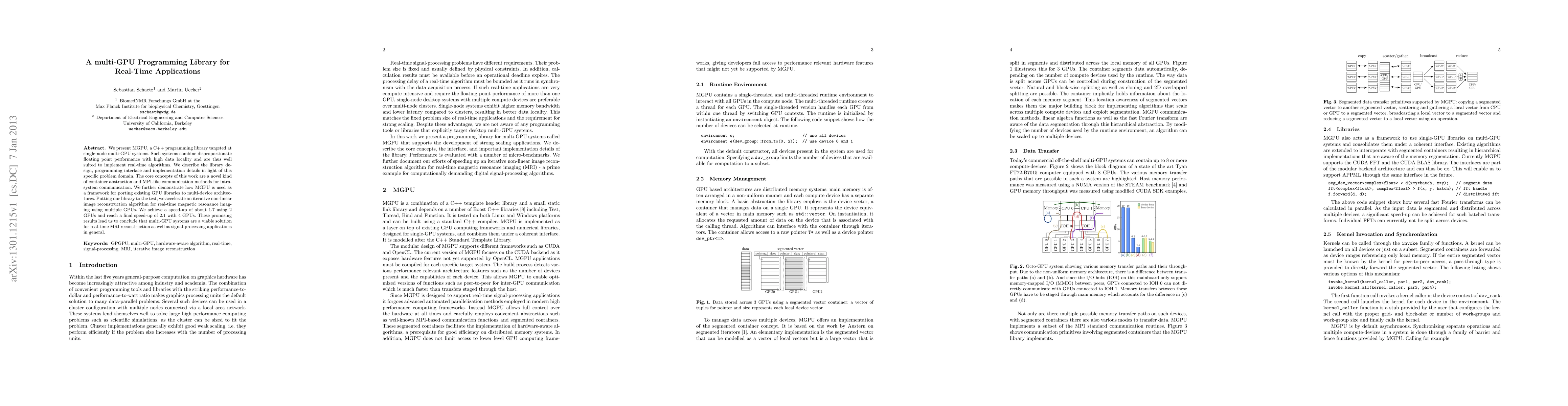 MGPU is a C++ library designed for real-time applications on single-node multi-GPU systems, leveraging container abstractions and MPI-like communication methods. It demonstrates significant speed-ups in real-time MRI reconstruction, achieving up to 2.1x with 4 GPUs, proving multi-GPU systems' efficacy for such tasks.
