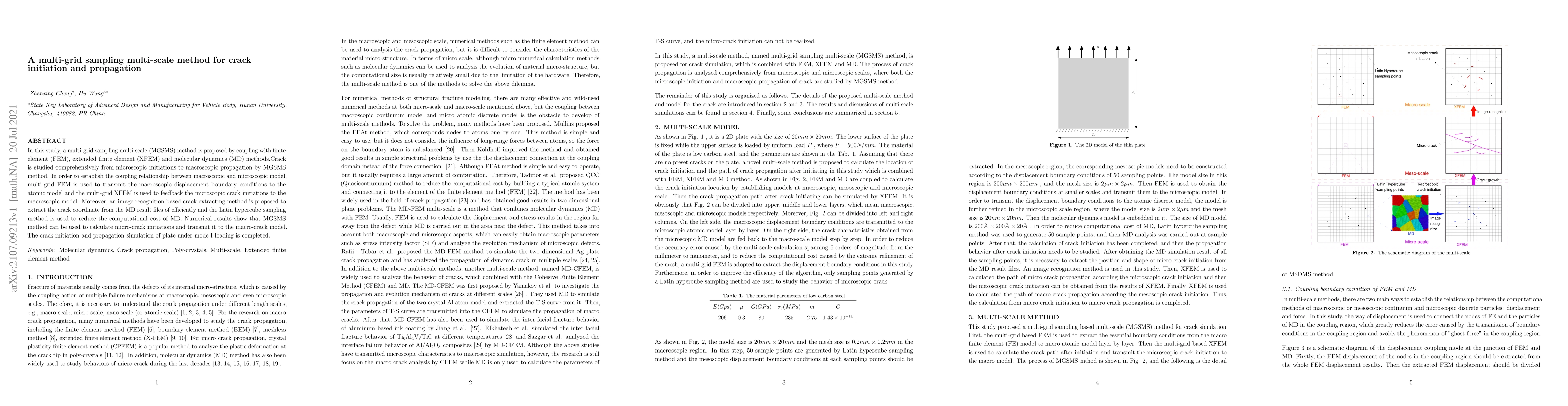 This paper proposes a multi-grid sampling multi-scale (MGSMS) method that combines finite element, extended finite element, and molecular dynamics methods to study crack initiation and propagation from microscopic to macroscopic scales. The method efficiently transmits boundary conditions and crack information between scales, demonstrating its effectiveness through simulations of crack behavior in a plate under mode I loading.