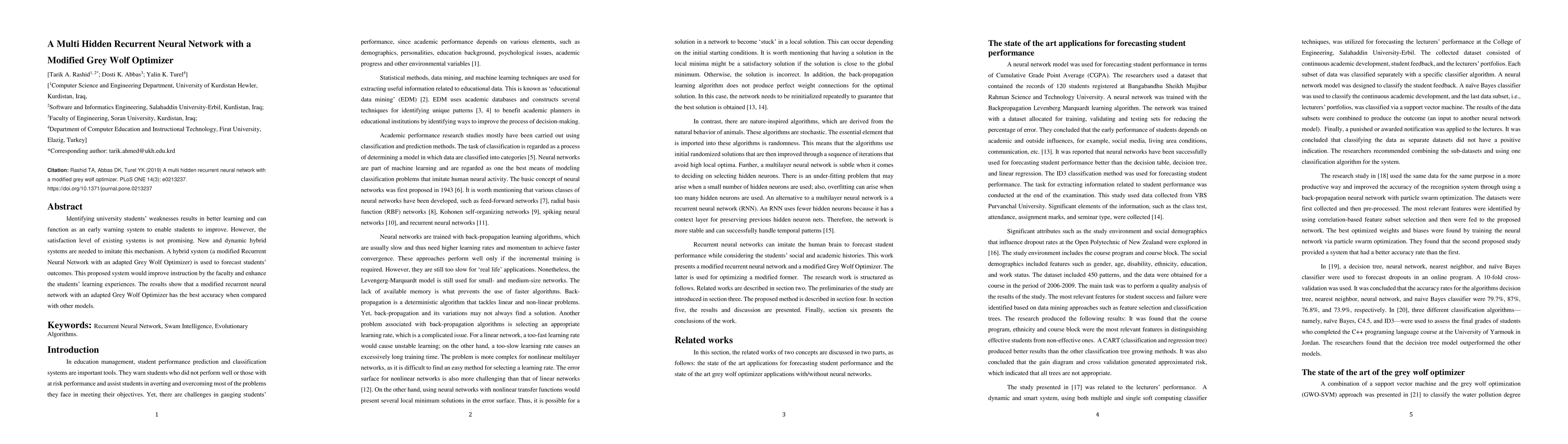 This paper proposes a hybrid system combining a multi hidden Recurrent Neural Network with a modified Grey Wolf Optimizer to predict university students' academic outcomes. The system demonstrates superior accuracy in forecasting student performance compared to other models, potentially improving instructional strategies and student learning experiences.