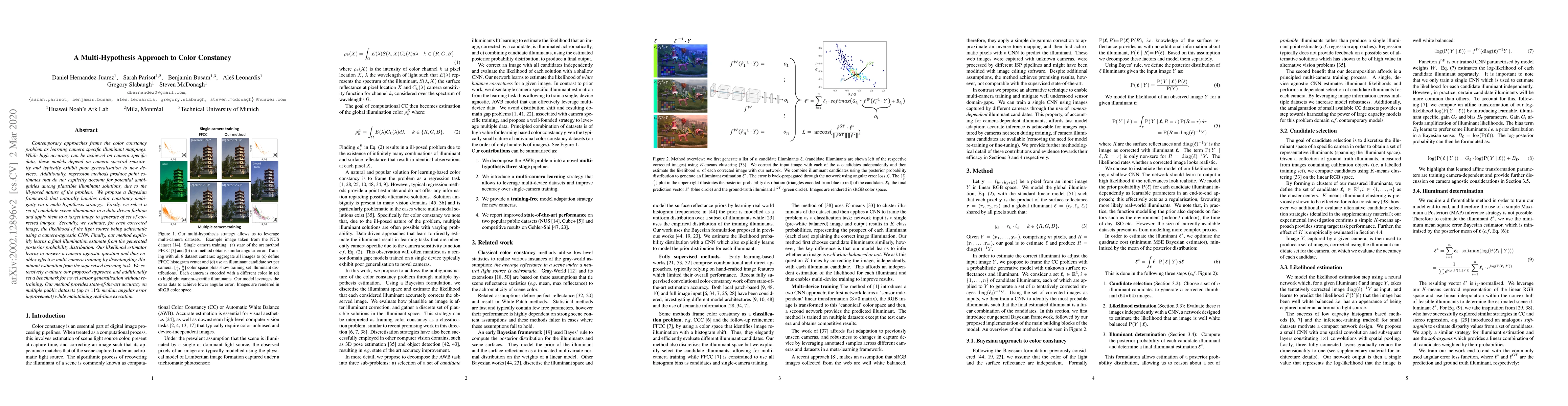 This paper proposes a Bayesian multi-hypothesis approach for color constancy that selects plausible illuminant candidates and generates a posterior probability distribution for illumination estimation. The method achieves state-of-the-art accuracy and generalizes well across different cameras without re-training.