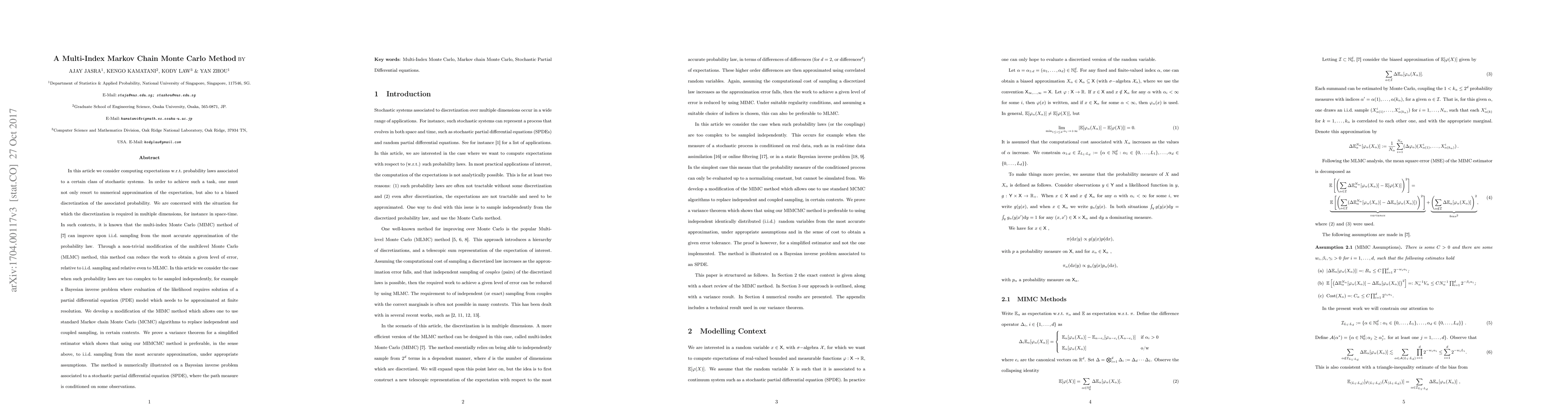 This paper proposes a Multi-Index Markov Chain Monte Carlo (MIMCMC) method to efficiently compute expectations for complex stochastic systems. It improves upon traditional i.i.d. sampling and multilevel Monte Carlo methods, especially in multi-dimensional contexts, by leveraging MCMC algorithms for biased discretization.