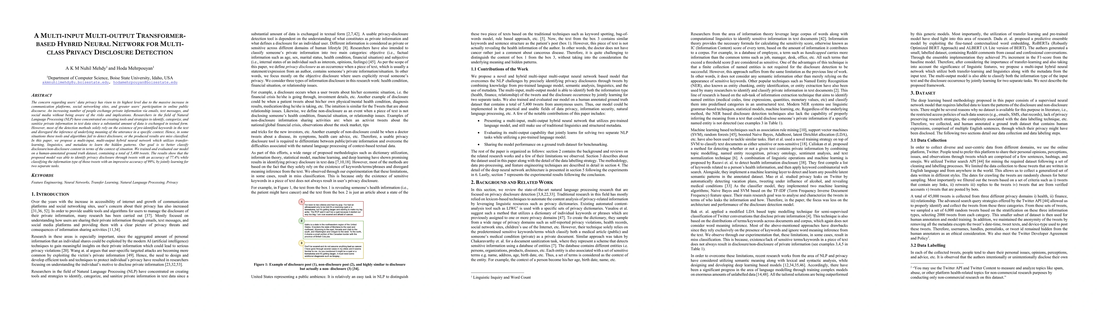 The concern regarding users' data privacy has risen to its highest level due to the massive increase in communication platforms, social networking sites, and greater users' participation in online public discourse. An increasing number of people exchange private information via emails, text messages, and social media without being aware of the risks and implications. Researchers in the field of Natural Language Processing (NLP) have concentrated on creating tools and strategies to identify, categorize, and sanitize private information in text data since a substantial amount of data is exchanged in textual form. However, most of the detection methods solely rely on the existence of pre-identified keywords in the text and disregard the inference of the underlying meaning of the utterance in a specific context. Hence, in some situations, these tools and algorithms fail to detect disclosure, or the produced results are miss-classified. In this paper, we propose a multi-input, multi-output hybrid neural network which utilizes transfer-learning, linguistics, and metadata to learn the hidden patterns. Our goal is to better classify disclosure/non-disclosure content in terms of the context of situation. We trained and evaluated our model on a human-annotated ground truth dataset, containing a total of 5,400 tweets. The results show that the proposed model was able to identify privacy disclosure through tweets with an accuracy of 77.4% while classifying the information type of those tweets with an impressive accuracy of 99%, by jointly learning for two separate tasks.
