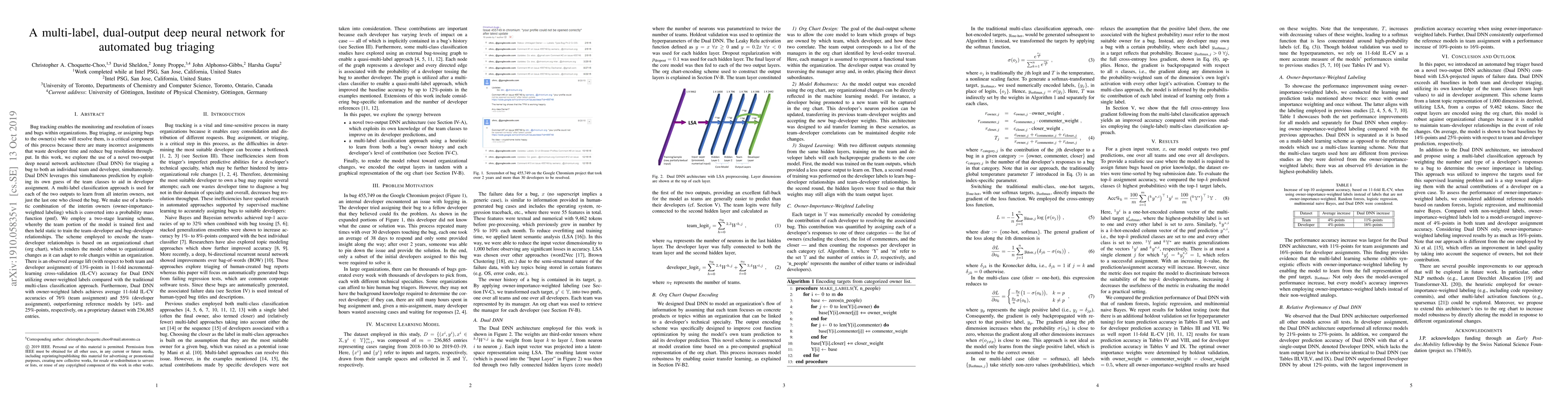 This paper proposes a dual-output deep neural network (Dual DNN) for automated bug triaging, assigning bugs to both teams and developers simultaneously. The model uses a multi-label classification approach and an owner-importance-weighted labeling scheme, achieving an average 13% improvement in accuracy over traditional methods, with 76% accuracy for team assignment and 55% for developer assignment.