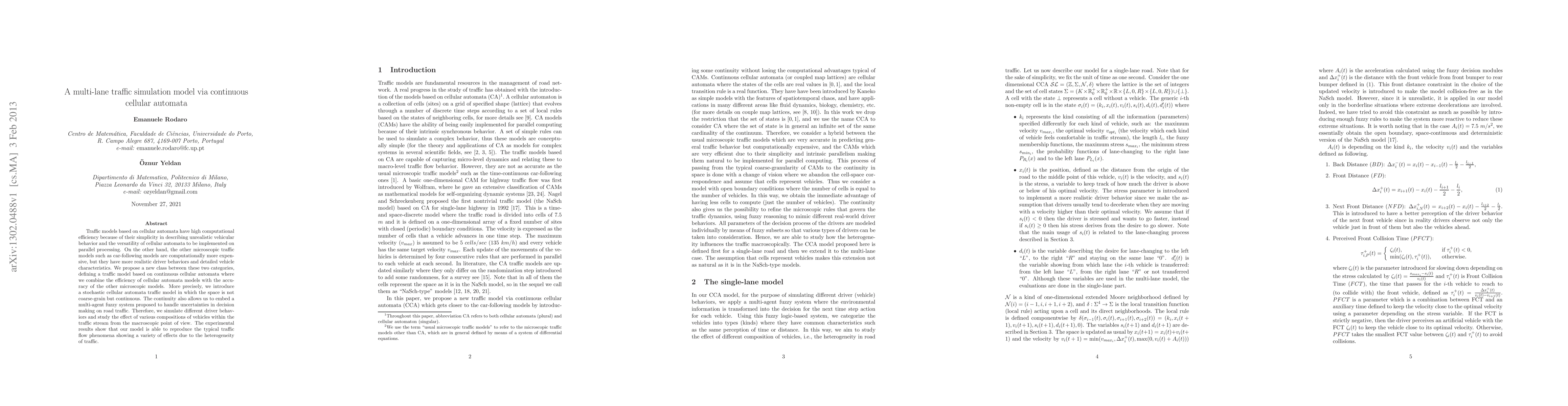 This paper proposes a multi-lane traffic simulation model using continuous cellular automata, combining the computational efficiency of cellular automata with the accuracy of microscopic models. It employs a stochastic approach to handle uncertainties and simulates diverse driver behaviors, demonstrating the model's ability to reproduce typical traffic flow phenomena.