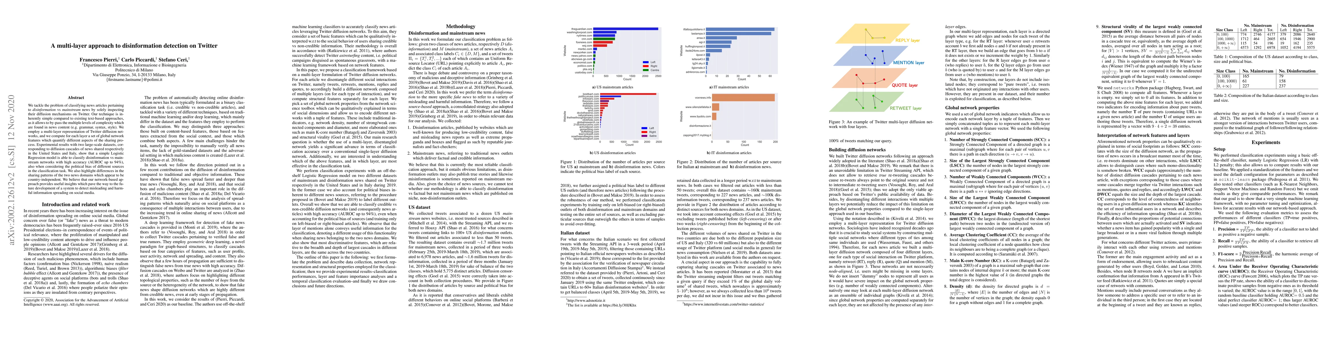 This paper proposes a multi-layer network analysis approach to detect disinformation on Twitter by examining diffusion patterns rather than text content. A Logistic Regression model achieves high accuracy in classifying disinformation vs. mainstream news, highlighting country-independent differences in sharing patterns.