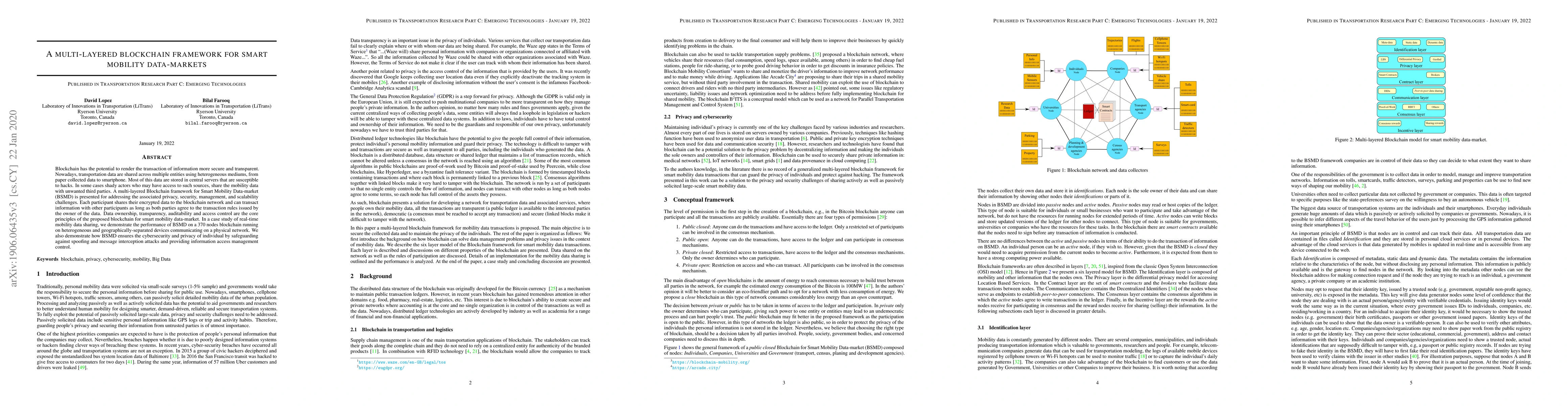The paper proposes a multi-layered blockchain framework, BSMD, for secure and transparent smart mobility data transactions, addressing privacy, security, management, and scalability challenges. BSMD demonstrates cybersecurity and privacy protection through encrypted data sharing and access control in a real-time case study involving 370 nodes.