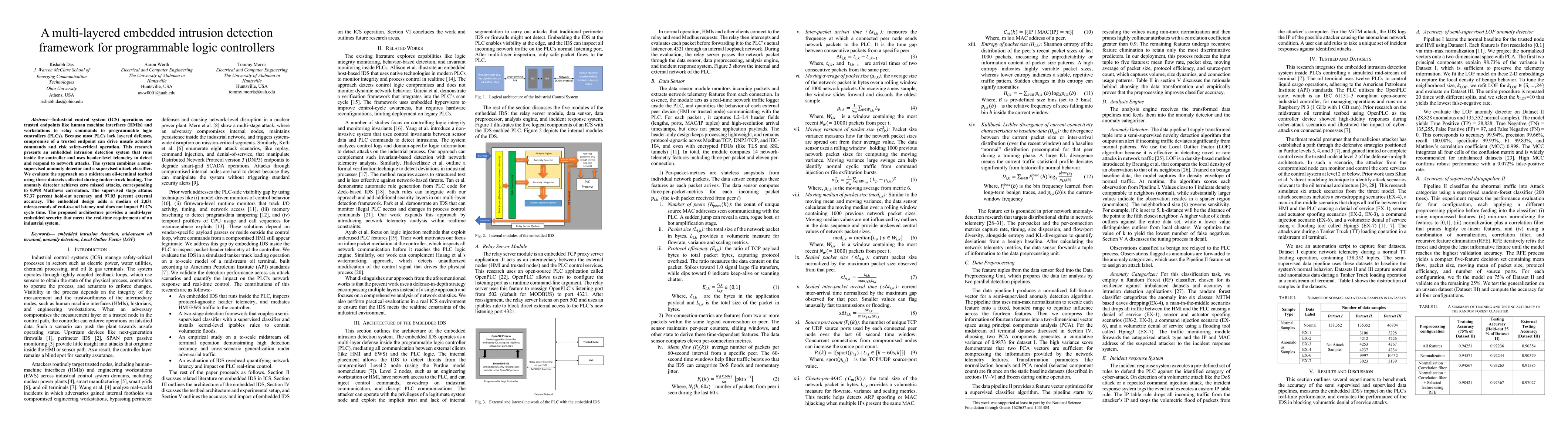 The research presents an embedded intrusion detection framework within PLCs, utilizing header-level telemetry data. It combines a semi-supervised anomaly detector (LOF) and a supervised attack classifier (Random Forest) to identify network attacks. The system is evaluated on midstream oil-terminal testbed datasets collected during tanker-truck loading operations.