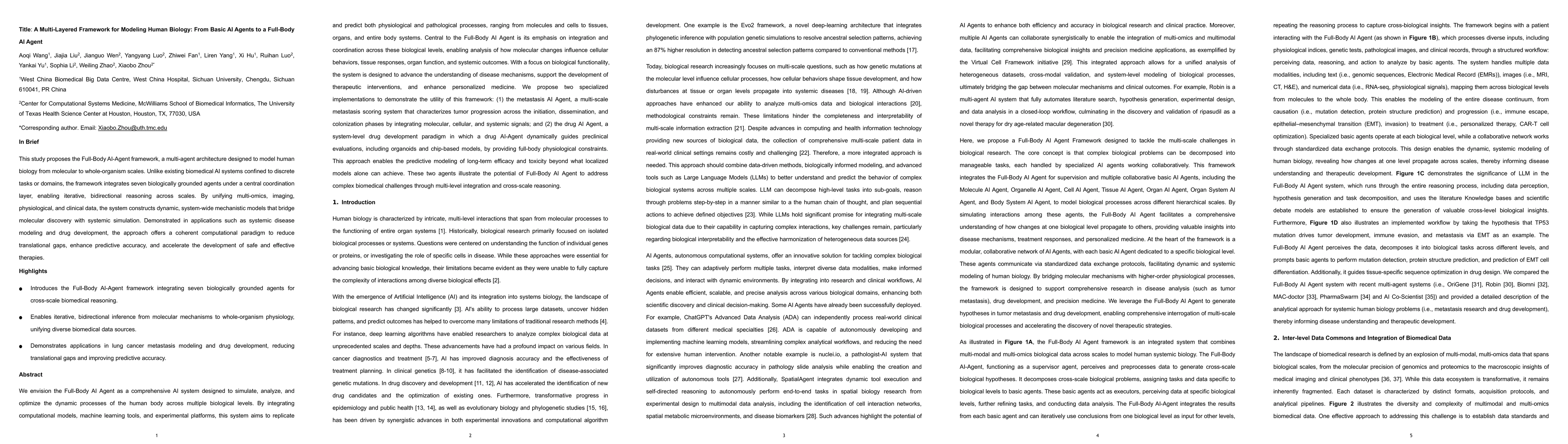 We envision the Full-Body AI Agent as a comprehensive AI system designed to simulate, analyze, and optimize the dynamic processes of the human body across multiple biological levels. By integrating computational models, machine learning tools, and experimental platforms, this system aims to replicate and predict both physiological and pathological processes, ranging from molecules and cells to tissues, organs, and entire body systems. Central to the Full-Body AI Agent is its emphasis on integration and coordination across these biological levels, enabling analysis of how molecular changes influence cellular behaviors, tissue responses, organ function, and systemic outcomes. With a focus on biological functionality, the system is designed to advance the understanding of disease mechanisms, support the development of therapeutic interventions, and enhance personalized medicine. We propose two specialized implementations to demonstrate the utility of this framework: (1) the metastasis AI Agent, a multi-scale metastasis scoring system that characterizes tumor progression across the initiation, dissemination, and colonization phases by integrating molecular, cellular, and systemic signals; and (2) the drug AI Agent, a system-level drug development paradigm in which a drug AI-Agent dynamically guides preclinical evaluations, including organoids and chip-based models, by providing full-body physiological constraints. This approach enables the predictive modeling of long-term efficacy and toxicity beyond what localized models alone can achieve. These two agents illustrate the potential of Full-Body AI Agent to address complex biomedical challenges through multi-level integration and cross-scale reasoning.
