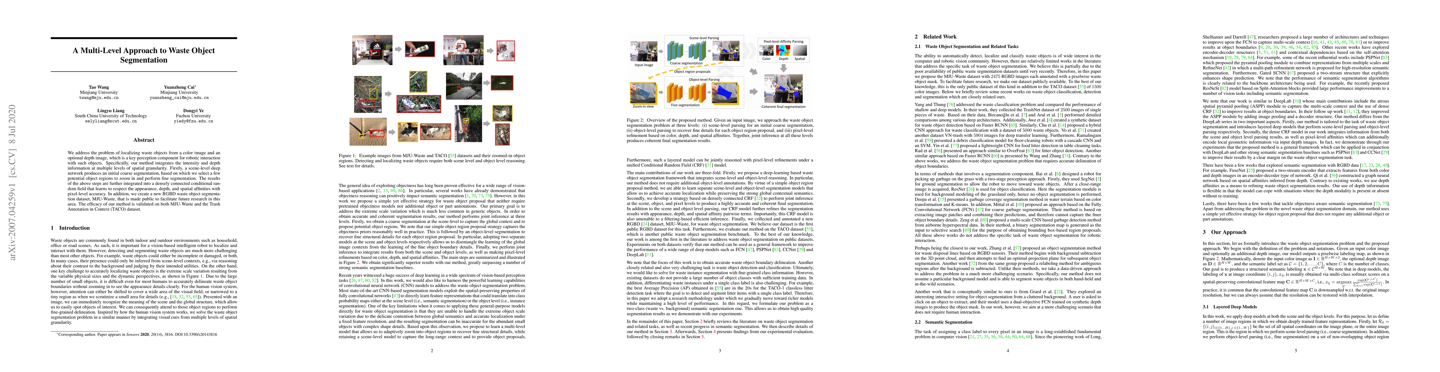 We address the problem of localizing waste objects from a color image and an optional depth image, which is a key perception component for robotic interaction with such objects. Specifically, our method integrates the intensity and depth information at multiple levels of spatial granularity. Firstly, a scene-level deep network produces an initial coarse segmentation, based on which we select a few potential object regions to zoom in and perform fine segmentation. The results of the above steps are further integrated into a densely connected conditional random field that learns to respect the appearance, depth, and spatial affinities with pixel-level accuracy. In addition, we create a new RGBD waste object segmentation dataset, MJU-Waste, that is made public to facilitate future research in this area. The efficacy of our method is validated on both MJU-Waste and the Trash Annotation in Context (TACO) dataset.