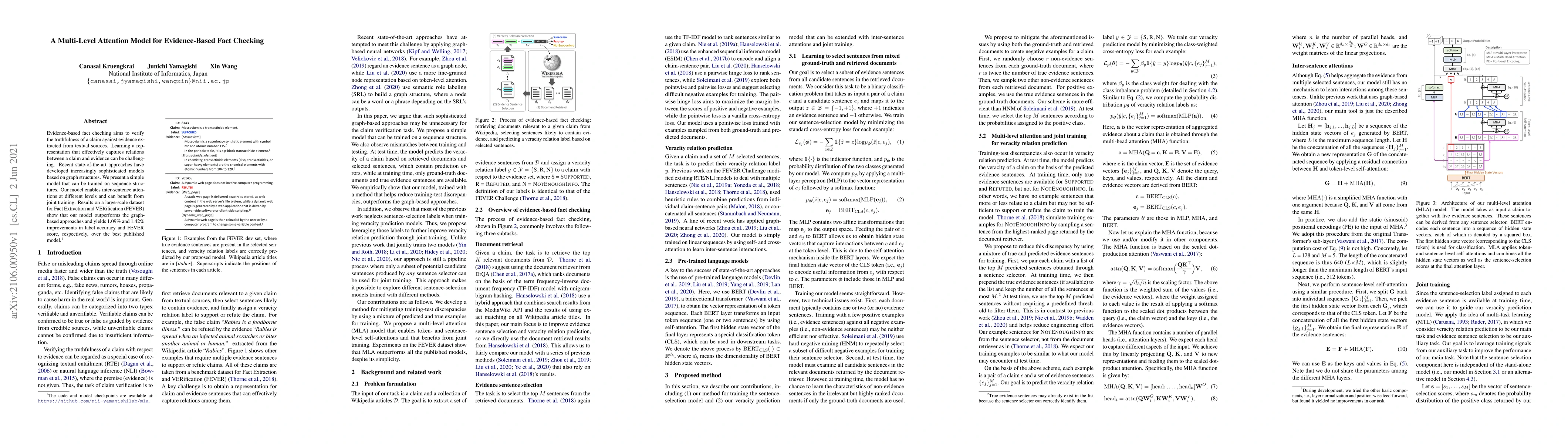 This paper introduces a multi-level attention model for evidence-based fact checking that outperforms graph-based approaches, achieving 1.09% and 1.42% improvements in label accuracy and FEVER score on a large-scale dataset, leveraging inter-sentence attentions and joint training.