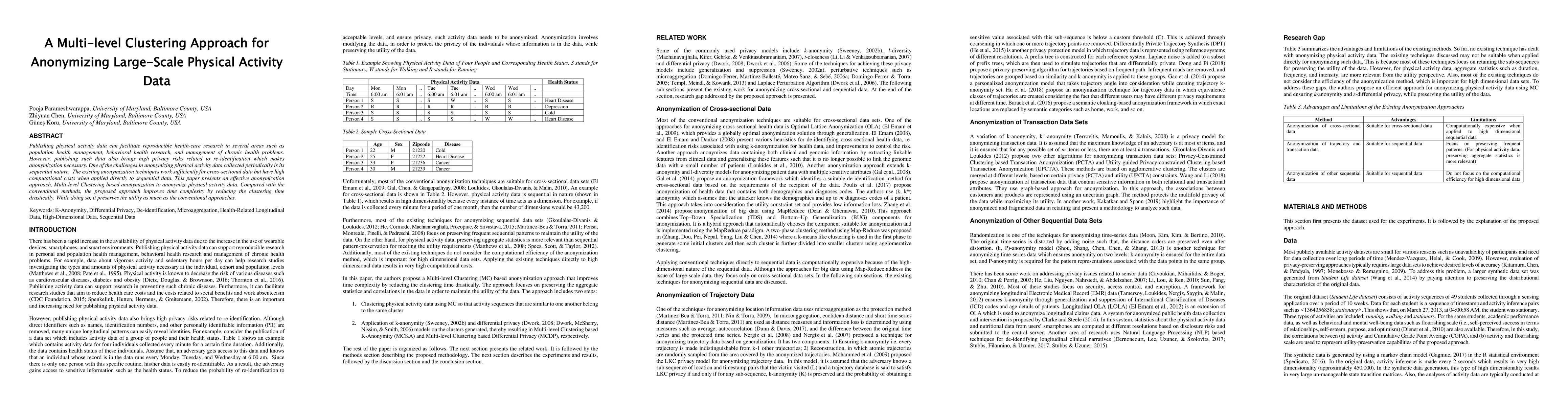 Publishing physical activity data can facilitate reproducible health-care research in several areas such as population health management, behavioral health research, and management of chronic health problems. However, publishing such data also brings high privacy risks related to re-identification which makes anonymization necessary. One of the challenges in anonymizing physical activity data collected periodically is its sequential nature. The existing anonymization techniques work sufficiently for cross-sectional data but have high computational costs when applied directly to sequential data. This paper presents an effective anonymization approach, Multi-level Clustering based anonymization to anonymize physical activity data. Compared with the conventional methods, the proposed approach improves time complexity by reducing the clustering time drastically. While doing so, it preserves the utility as much as the conventional approaches.
